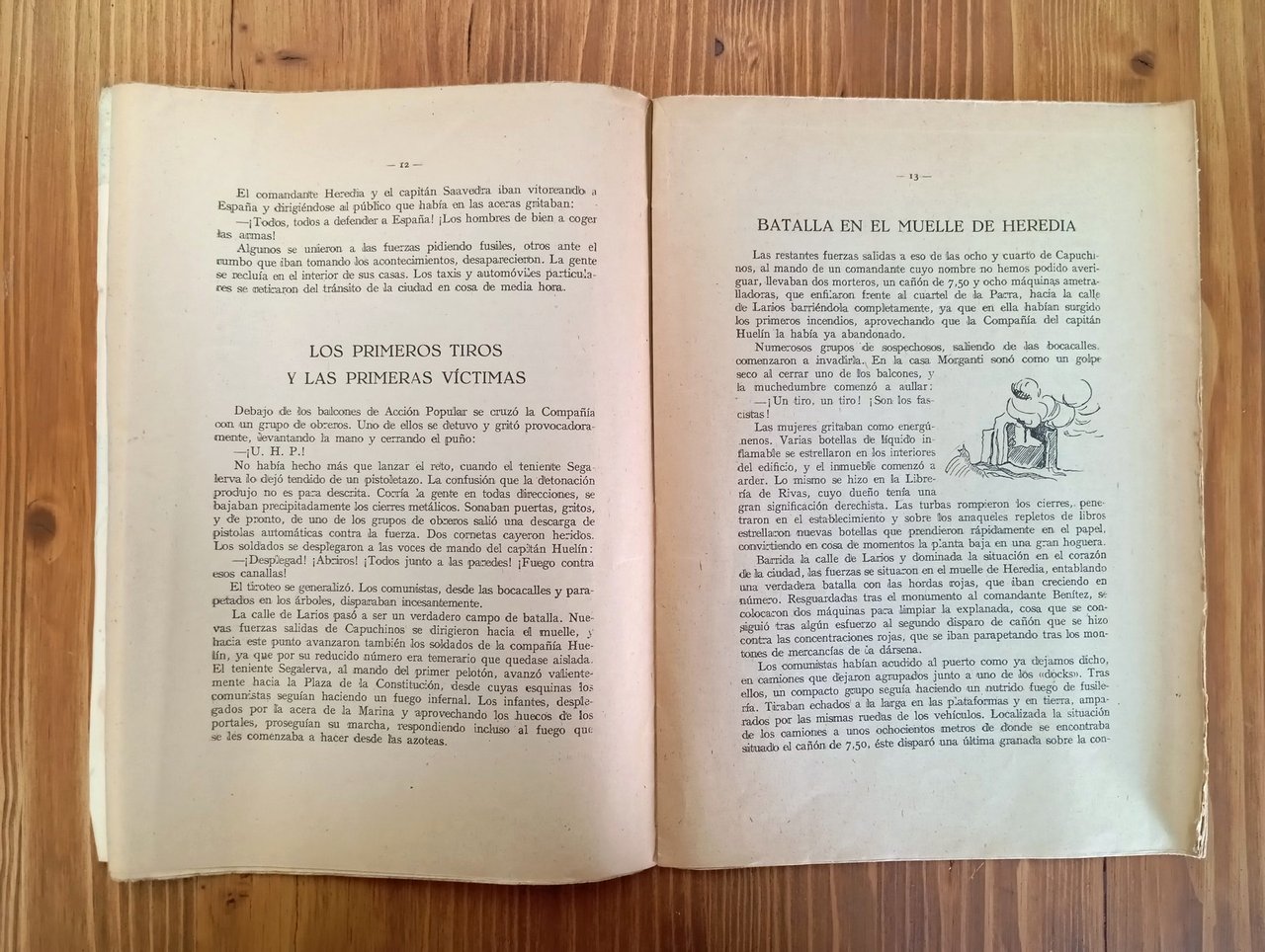 Edizione spagnola; senza data, ma intorno agli anni 30 del Novecento. "Episodios de la Guerra Civil", no. 6 - Brossura originale con copertina illustrata a colori, 32 pagine a fogli ancora chiusi; illustrazioni di S.F. Copertina slegata, segni d'uso e del tempo alle carte; copia nel complesso più che accettabile.