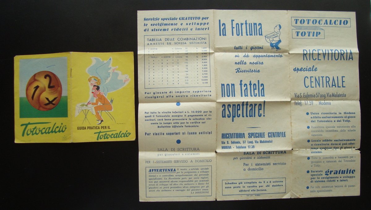 libretto, Guida pratica per TOTOCALCIO Gros Monti & C., Torino, s.d.(anni '50), cm 13,5x9,5, pp. 16, brossura ed. coperitna illustrata a colori da Savelli + volantino ripiegato pi√π volte Ricevitoria speciale Centrale Modena Condizioni di conservazione. Esemplari in buono stato con leggere tracce d'uso e del tempo. OPEB.4291 blu