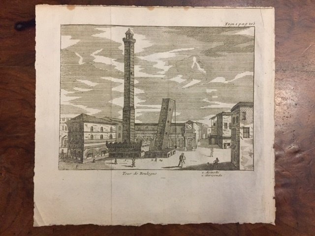 Tour de Boulogne 1. Asinelli 2. Garisenda (Alto destra) Tom. 1. pag. 215. [Veduta delle torri degli Asinelli e Garisenda di Bologna]