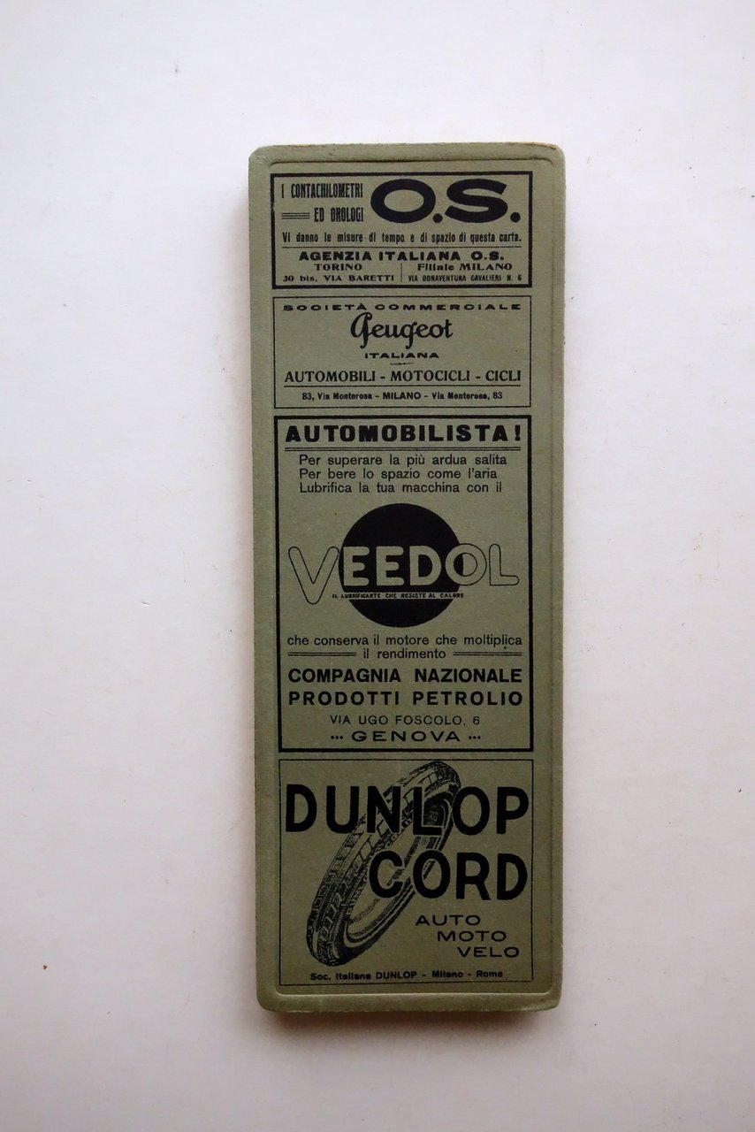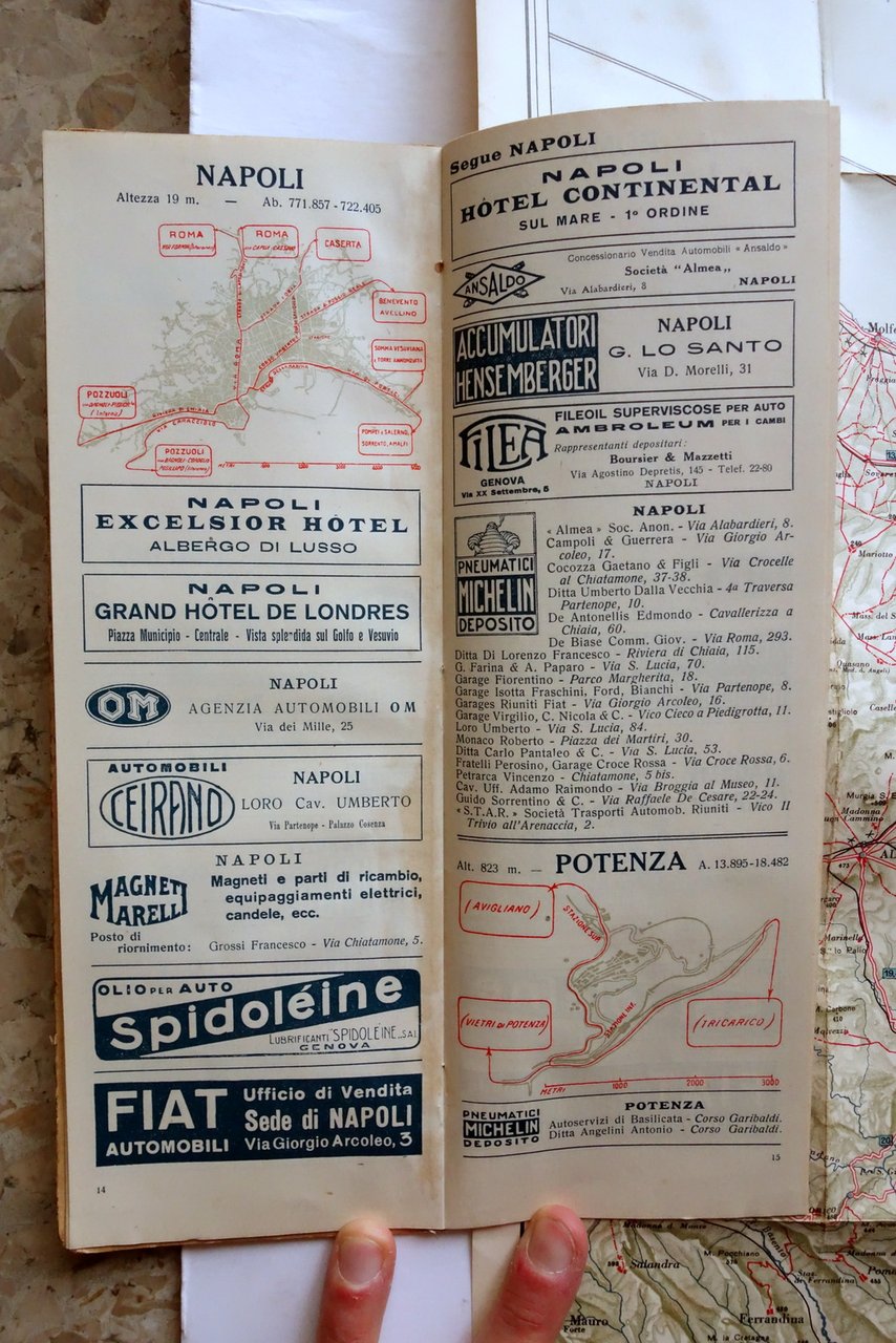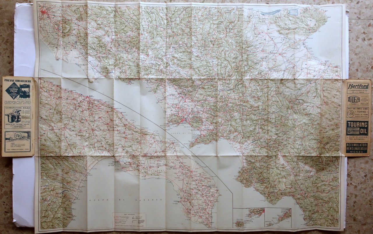 Grande carta automobilistica, Touring Club Italiano Grande Carta Automobilistica foglio 6 Napoli - Potenza - Matera - Bari - Lecce scala 1:300.000 Bertarelli ed., s. d. ma 1915 circa; grande carta automobilistica rip. più volte, a colori, applicata su due piatti in cartonato con bella grafica d'epoca. Alcune belle pubblicità a colori (vedi foto). Cm Condizioni di conservazione Buone condizioni con leggere tracce d'uso. OPEB.5636 N