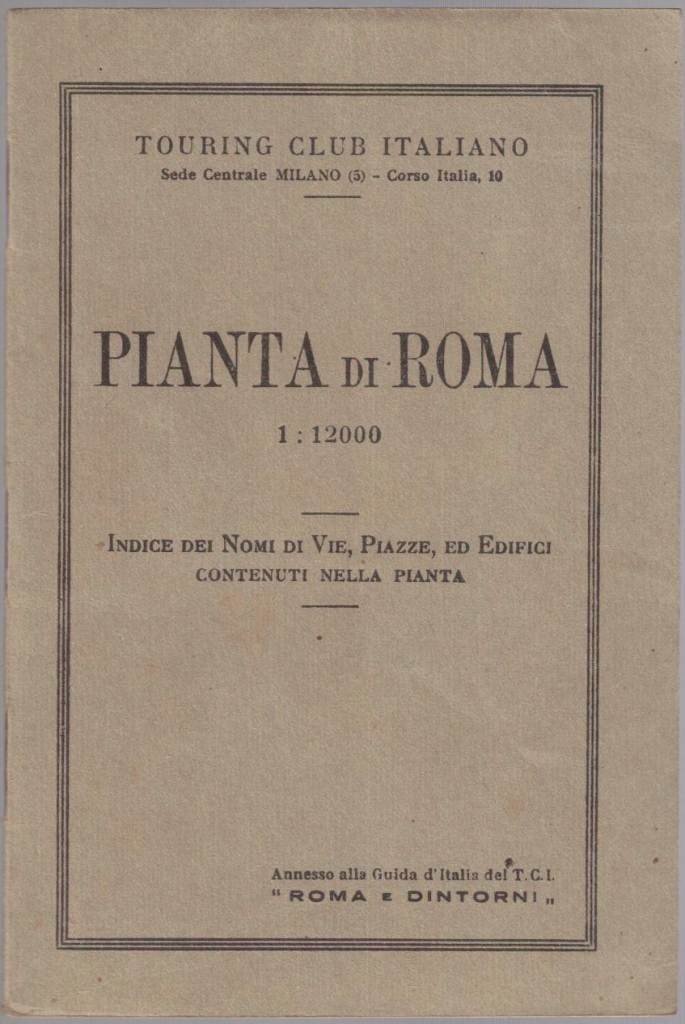 Touring Club Italiano – Sede Centrale di Milano, Pianta di Roma. 1 : 12000. Indice dei nomi di vie, piazze, ed edifici contenuti nella pianta, s.n. (ma Touring Club Italiano), s.l. (ma Milano, stampa G. Ricordi e C.) s.d. (ma 1920 ca.), paginazione varia per un totale di pp. 35, 3 c. di tavv. f.t. ripiegate ill. col. fronte retro con pianta della città di Roma (al retro la pianta è bicromatica con indicazione di lineee di autobus e tramviarie), cm 16, rilegatura ed. a punto metallico. Descrizione effettuata sulla base della prima di copertina. In calce alla prima di copertina: Annesso alla Guida d’Italia del T.C.I. Roma e dintorni. Perfetto.