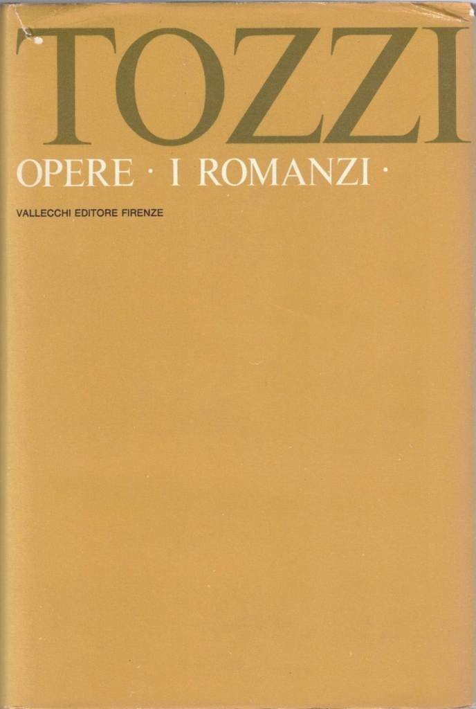 Federigo Tozzi, Opere I. I romanzi, Vallecchi Editore, s.l. (ma stampato a Firenze, presso la Vallecchi Editore Officine Grafiche) 1961, pp. 593, 1 c. di tav. f.t. ill. b.n. con ritratto dell’autore, cm 21, cart. ed. con titoli in oro al dorso e sovraccoperta. Volume a cura di Glauco Tozzi. Indice: Con gli occhi chiusi – Tre croci – Il podere – Gli egoisti – Ricordi di un impiegato – G. Tozzi, Notizie sui romanzi di Federigo Tozzi. Due strappetti senza mancanze a margine della sovraccoperta, per il resto molto ben conservato.