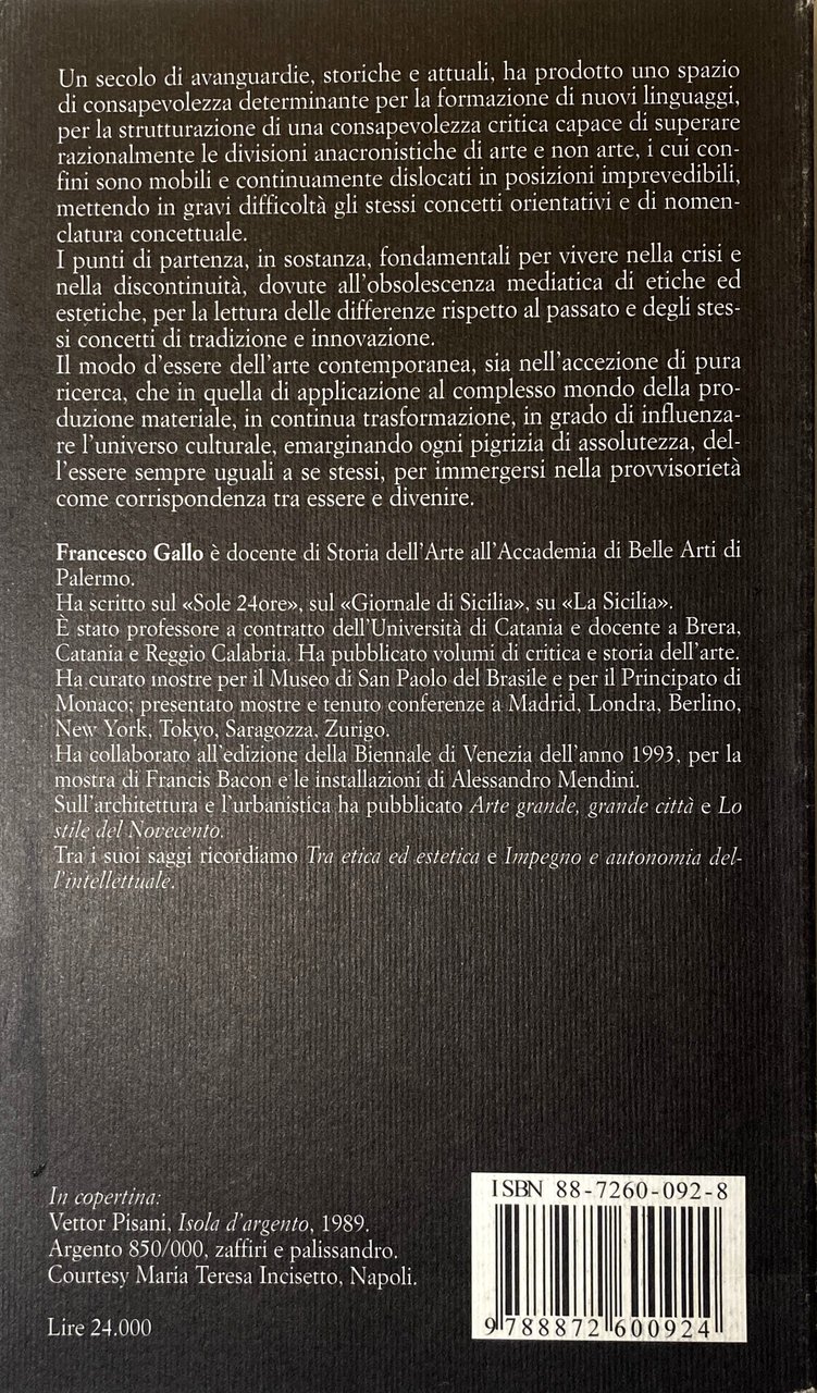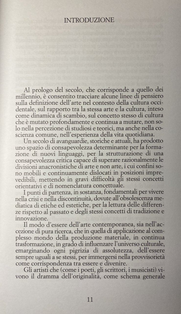 Un secolo di avanguardie, storiche e attuali, ha prodotto uno spazio di consapevolezza determinante per la formazione di nuovi linguaggi, per la strutturazione di una consapevolezza critica capace di superare razionalmente le divisioni anacronistiche di arte e non arte, i cui confini sono mobili e continuamente dislocati in posizioni imprevedibili, mettendo in gravi difficoltà gli stessi concetti orientativi e di nomenclatura concettuale. I punti di partenza, in sostanza, fondamentali per vivere nella crisi e nella discontinuità, dovute all'obsolescenza mediatica di etiche ed estetiche, per la lettura delle differenze rispetto al passato e degli stessi concetti di tradizione e innovazione. Il modo d'essere dell'arte contemporanea, sia nell'accezione di pura ricerca, che in quella di applicazione al complesso mondo della produzione materiale, in continua trasformazione, in grado di influenzare l'universo culturale, emarginando ogni pigrizia di assolutezza, dell'essere sempre uguali a se stessi, per immergersi nella provvisorietà come corrispondenza tra essere e divenire.