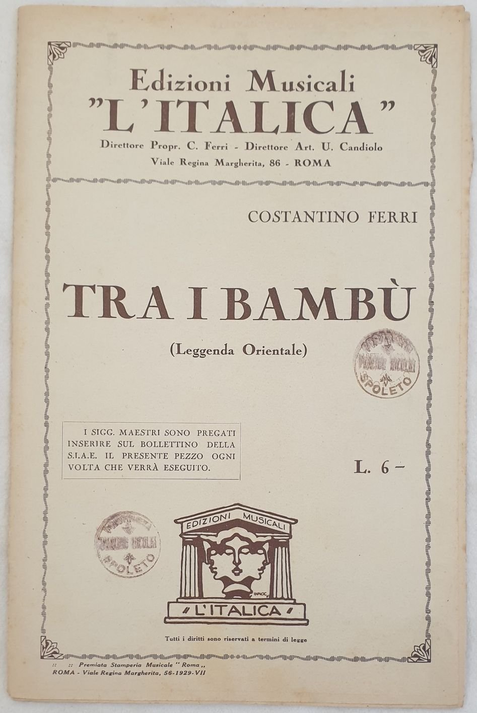 Partitura per orchestra del 1929 della melodia "Tra i bambù" di Costantino Ferri.<BR>Copertina morbida editoriale.<BR>GENERE: STRUMENTI: pianoforte, violini; violoncello, sassofono, contrabasso, flauto, clarinetto, oboe, tromba, trombone, batteria<BR>ANNO: 1928 DIMENSIONI: In 8. cm 26,5x17<BR>PAGINE: pp. 15 CONDIZIONI: Buone condizioni. Qualche strappo. Ex libris in copertina. Score for orchestra of 1929 of the melody "Tra i bambù" by Costantino Ferri. Editorial soft cover. MUSIC: STRUMENTI: piano, violin; violoncello, saxophone, contrabbass, flute, clarinet, oboe, trumpet, trombone, drums YEAR: 1928 SIZE: In 8. cm 26,5x17 PAGES: pp. 15 CONDITIONS: Good conditions. Some tears. Ex libris in the cover