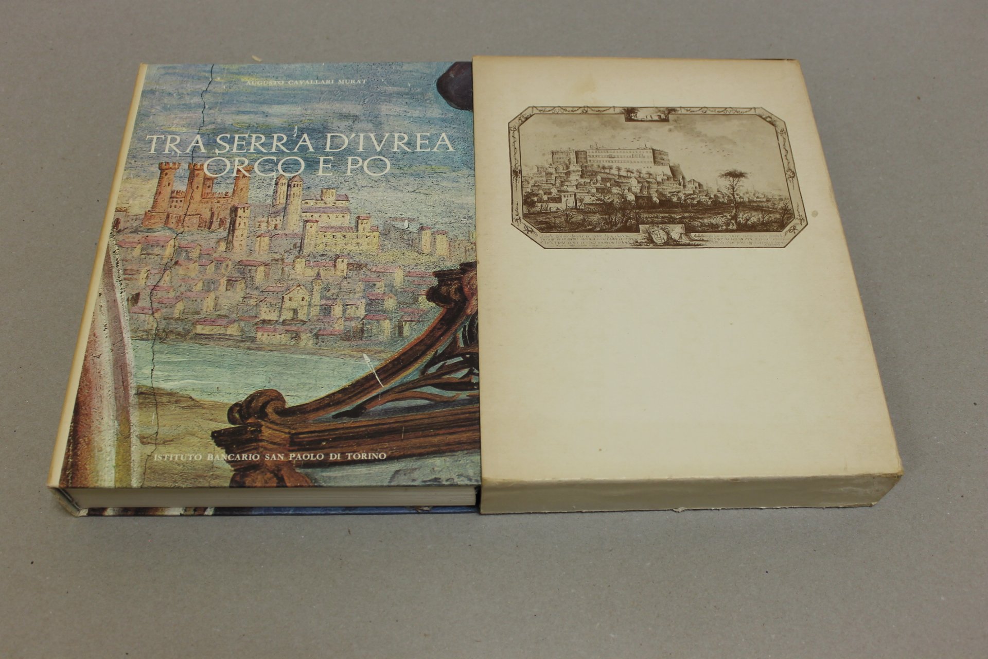 Augusto Cavallari Murat Tra Serra D'Ivrea Orco e Po. Torino, Istituto Bancario San Paolo di Torino 1976 - I italiano, in quarto pp.478 Volume dedicato allo sviluppo culturale e artistico del territorio transappeninico piemontese compreso Serra d'Ivrea, Orco e Po, dal Medioevo all'epoca moderna. Opera corredata di un notevole apparato iconografico: foto in nero e a colori. Copertina cartonata. Cofanetto protettivo scolorito e un po'sporco. Taglio superiore del cofanetto brunito.