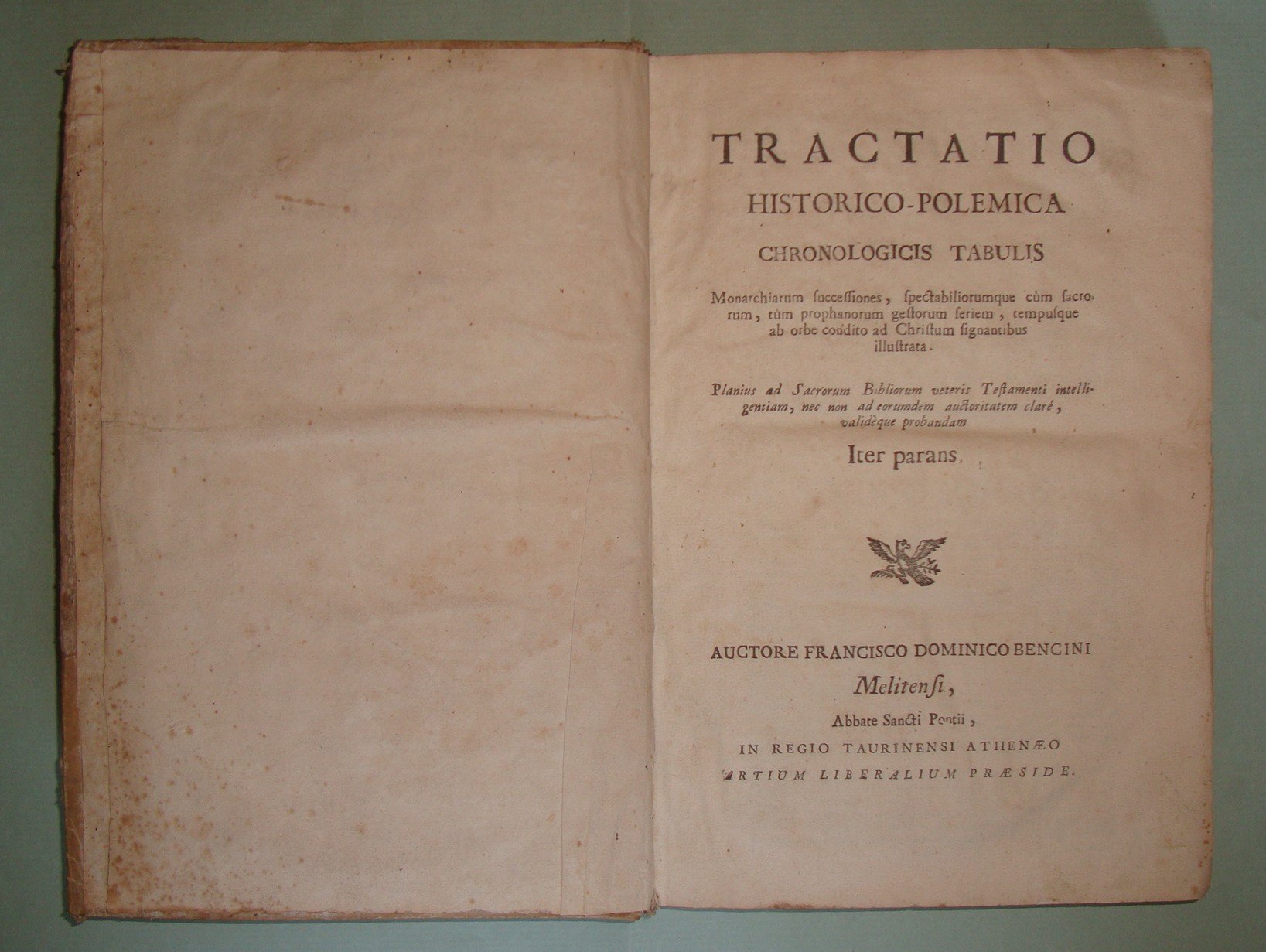Tractatio historico - polemica chronologicis tabulis monarchiarum successiones, spectabiliorumque cum sacrorum, tum prophanorum gestorum seiem, tempusque ab orbe condito ad Christum signantibus illustrata. In Regio Taurinensi Atheneo, s.a. (1720) In folio; pp.632 e 7 carte n.nn. di indice. Testo su due colonne. Pergamena coeva, dorso a cordoni, titolo calligrafato. Treccani.it: “Bencini Francesco Domenico. Nato a Malta (amava chiamarsi Maltensis o addirittura Africanus) intorno al 1664, si addottorò in teologia probabilmente a Roma, dove, titolare dell’abbazia di S. Ponzio, insegnò dal 1687 al 1720 nel Collegio Urbano de propaganda fide. Chiamato alla cattedra di teologia dogmatica dell'università di Torino rinnovata da Vittorio Amedeo, giunse nella capitale subalpina nel 1720 con i suoi duemila libri, per sistemare i quali subito chiese un alloggio migliore di quello che gli era stato assegnato. Iniziò i suoi corsi il 2 nov. 1720 e, ottenuto anche il titolo di abate di S. Costanzo, l’8 nov. 1729 diventò prefetto della Biblioteca universitaria e poi, il 25 sett. 1732, fu nominato preside delle Arti per un triennio e riconfermato per un altro trienno il 29 ott. 1735. Morì nel 1744”.
