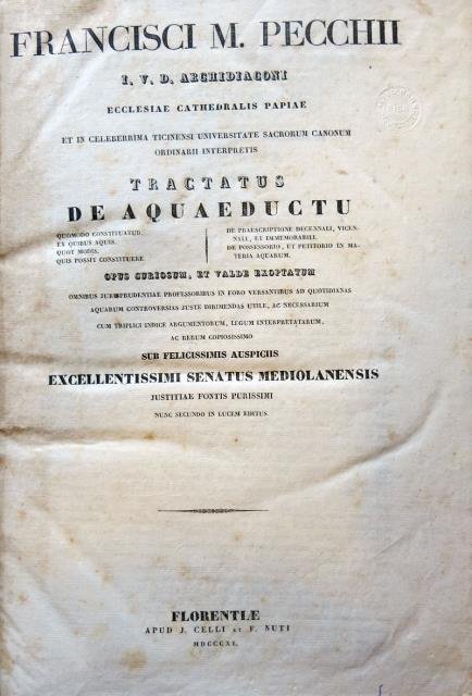 Florentiae, Apud Josephum Celli et F. Nuti, 1840. Opera divisa in quattro libri in unico volume in folio, opera completa. Diverse sono le date di edizione riportate per ciascun libro in cui l’opera è suddivisa e irregolare risulta talora la numerazione delle pagine. Libro primo, 1840, pp. (6), 523; libro secondo, 1842, pp. (6), 556; libro terzo, 1811, (14), 298, XLVI. Il libro terzo include il "Tractatur de Molendinis", in libro quarto. Sono presenti alcune grandi incisioni silografiche in b/n n. t., leg. in modesto cartonato con dorso in perg. e titolo ms., testo stampato su due colonne, dove ciascuna colonna reca il numero di pagina, carta fine dai margini irregolari. Francesco Maria Pecchio (o Pecchi) (Pavia 1620 – 1693), arcidiacono della cattedrale pavese, docente di diritto canonico e civile nell'università della sua città. In quest’opera ha saputo adattare l'antico diritto romano alle necessità della sua epoca, in un ventennale lavoro a tutt'oggi considerato insuperabile. Si tratta infatti del più importante trattato giuridico del XVII secolo, qui riedito in tiratura ottocentesca, sulla condotta delle acque e sulla irrigazione. Nato dalle lezioni universitarie di diritto tenute dal Pecchio e pubblicato sotto gli auspici del Senato di Milano, aveva l'obiettivo di colmare la carente legislazione coeva sul corretto utilizzo delle acque (fiumi, sorgenti, canali, acquedotti) soprattutto nell'Agro Pavese, e di fornire ai giureconsulti nozioni utili per dirimere le frequenti controversie e contestazioni in materia di servitù, di acquedotti e di irrigazione. L'opera verte sul governo delle acque pubbliche e private, sulla tecnica idraulica, sui diritti e servitù agrimensurali. Timbro di privata appartenenza al contropiatto e alla prima bianca. Piccole e rare fioriture, buona conservazione. .