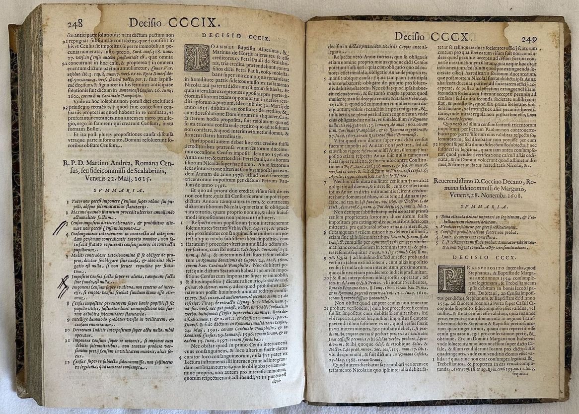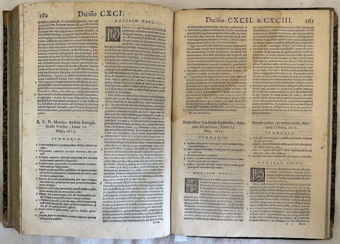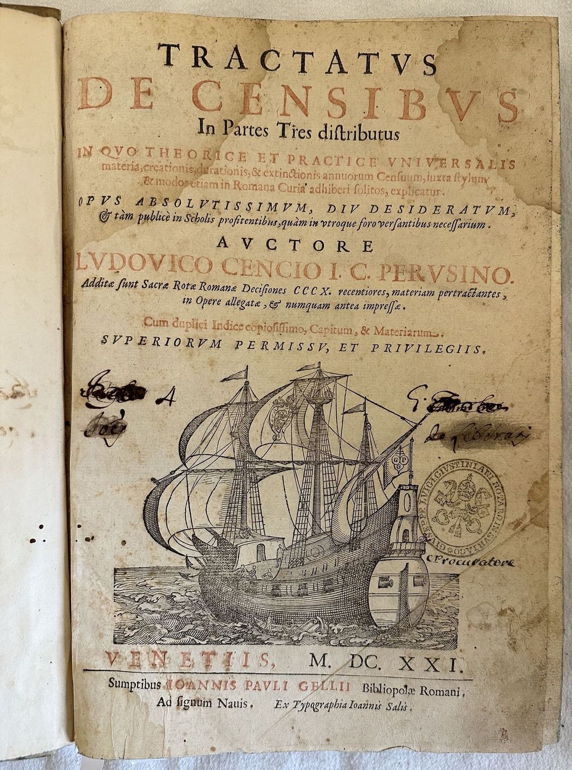 Edizione veneziana del 1621 di questo trattato sui censi del giuirista perugino Lodovico Cenci (m. 1637), docente nello Studio perugino e accademico insensato. Frontespizio stampato in rosso e in nero. Alla fine del volume, con frontespizio proprio "Decisiones Sacrae Rotae Romanae in corpore Tractatus de Censibus". Antica firma manoscritta al frontespizio e timbro di biblioteca privata. Marca editoriale: una nave in mare a vele spiegate; sulla vela centrale lo stemma di Paolo V, a poppa una bandiera con le iniziali GPG sormontate da doppia croce. Capilettera decorati e vignette. Antiche note manoscritte. Tagli marmorizzati. L'esemplare è stato confrontato con la digitalizzazione online ed è completo. In buone condizioni. Copertina ottocentesca in mezza pergamena con titolo manoscritto al dorso in buone condizioni generali con lievi usure ai margini e dorso. Legatura in buone condizioni. Pagine in buone condizioni con fioriture. Segni di tarlo dal contropiatto anteriore fino alla carta *8 senza perdita di testo. Rinforzo al margine destro di carta *5 e al margine di piegatura di carta *8 senza perdita di testo. Lievi gore d'umidità marginali. Carta bianca posta tra pag. 270 e sentenze della sacra Rota è mancante. In folio. Dim. 32x22 cm. Pp. (58)+11+(1)+270+(32)+250+(14). Peso Kg. 1,400.Venetian edition of 1621 of this treaty about census by the jurist from Perugia Lodovico Cenci (m. 1637), teacher and member of Insensati. Red and black title page. At the end of the volume, with its own title page "Decisiones Sacrae Rotae Romanae in corpore Tractatus de Censibus". Anctique handwritten signature in the title page and stamp of private library. Decorated capital letters and vignettes. Antique handwritten notes. External extremities are marbled. The copy has been compared to the digitalized copy and it is complete. In good conditions. Half parchemnt cover of XIX century with handwritten title in the spine in good general conditions lightly worn in the extremities. Binding in good conditions. Inside pages are in good conditions with foxing. Worming in the front counterplate to page *8 with no loss of text. Reinforcement in the folding edge of *5 and page *8 with no loss of text. Light dump stains in the edges. White page between pag. 270 and sentences of sacra Rota lacks. In folio. Dim. 32x22 cm. Pp. (58)+11+(1)+270+(32)+250+(14). Peso Kg. 1,400.