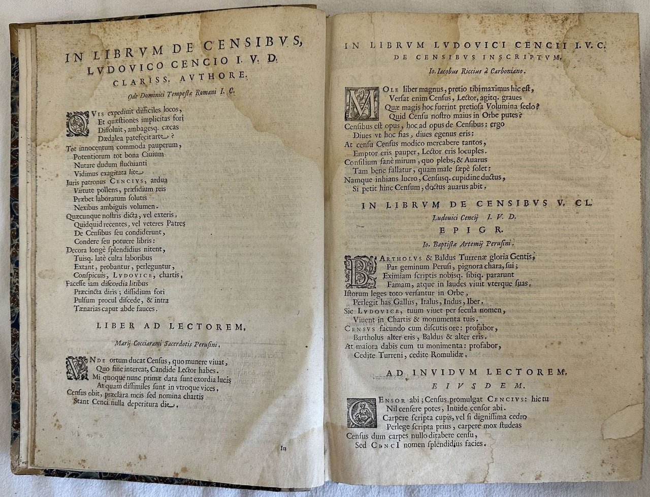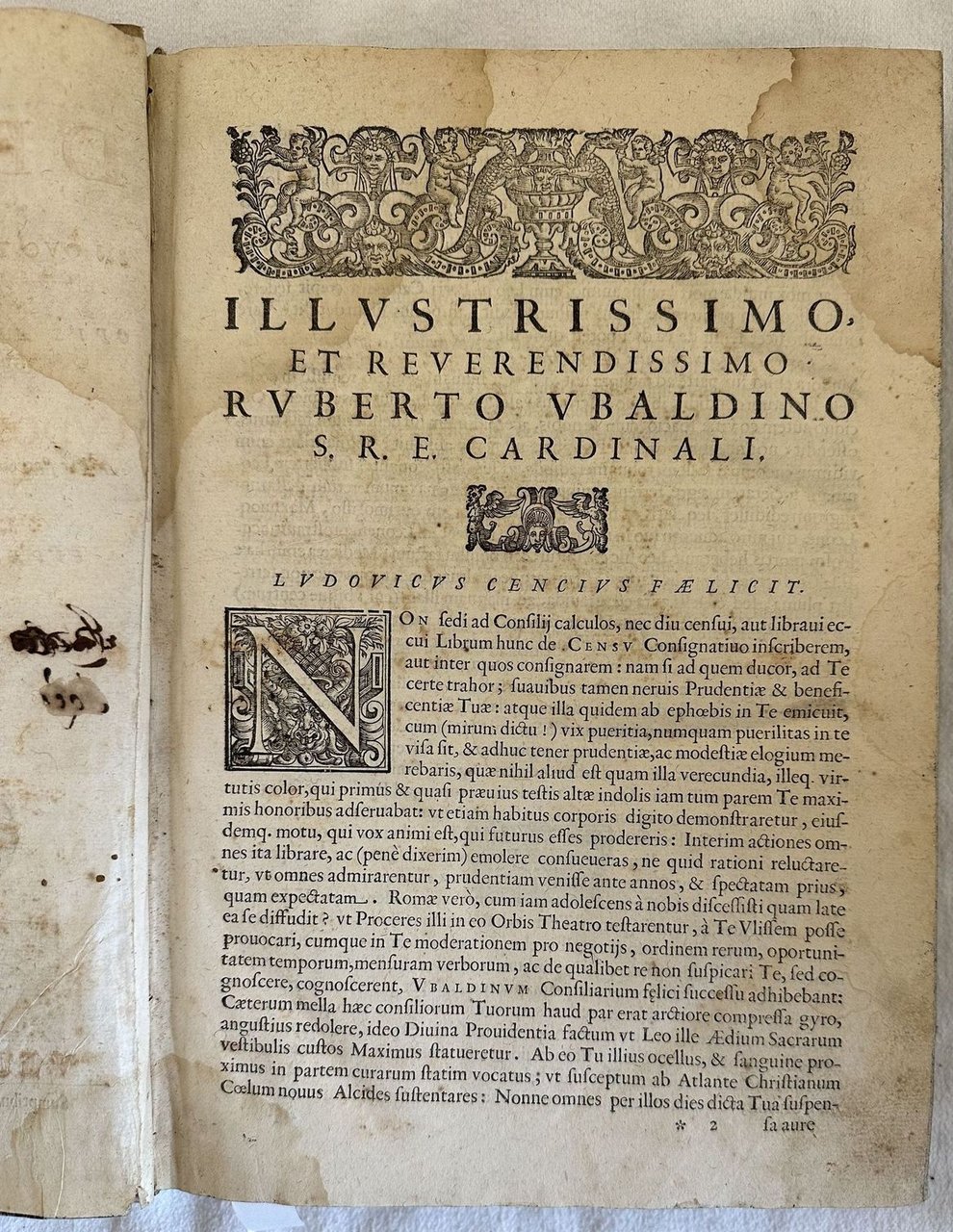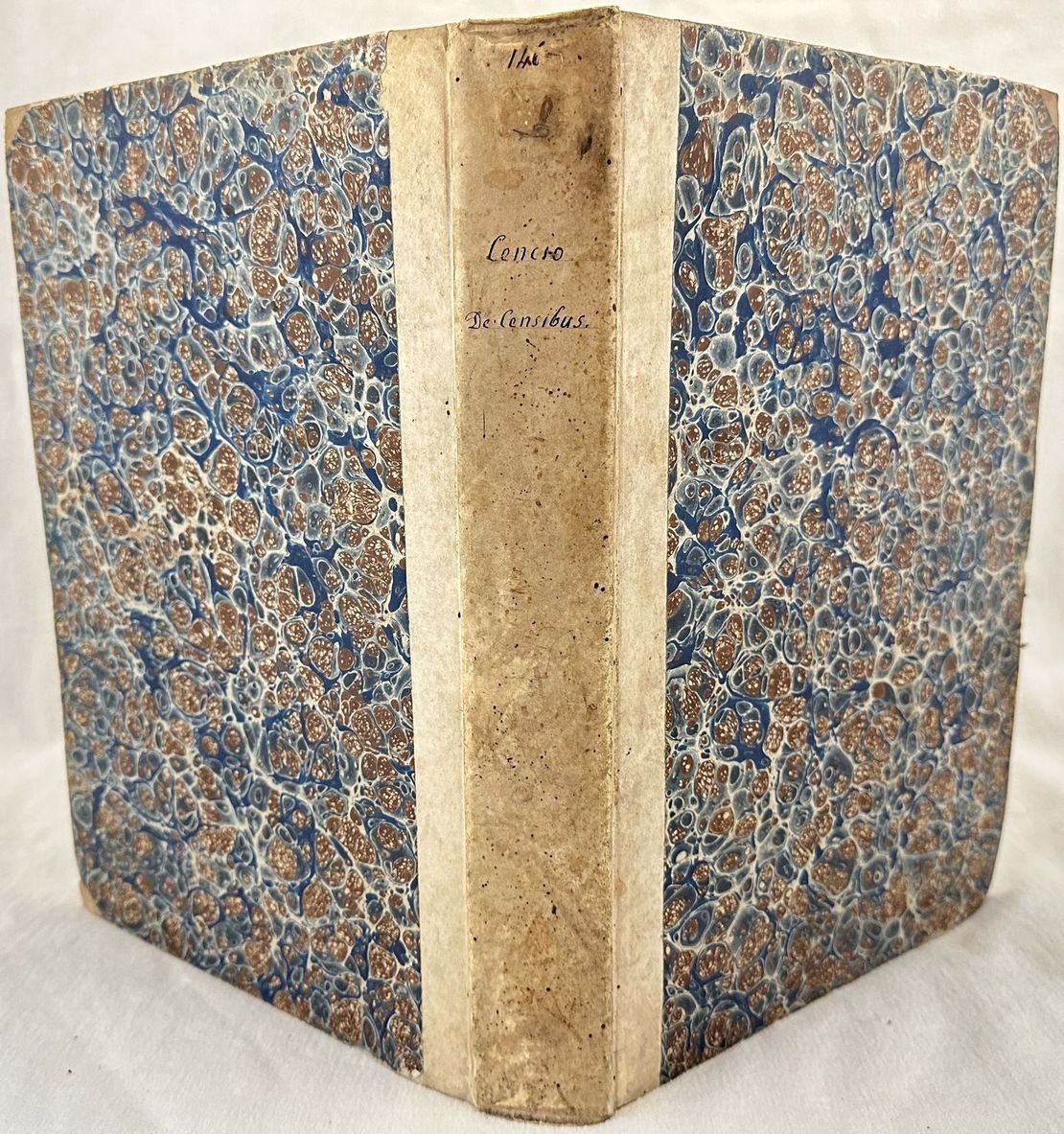 Edizione veneziana del 1621 di questo trattato sui censi del giuirista perugino Lodovico Cenci (m. 1637), docente nello Studio perugino e accademico insensato. Frontespizio stampato in rosso e in nero. Alla fine del volume, con frontespizio proprio "Decisiones Sacrae Rotae Romanae in corpore Tractatus de Censibus". Antica firma manoscritta al frontespizio e timbro di biblioteca privata. Marca editoriale: una nave in mare a vele spiegate; sulla vela centrale lo stemma di Paolo V, a poppa una bandiera con le iniziali GPG sormontate da doppia croce. Capilettera decorati e vignette. Antiche note manoscritte. Tagli marmorizzati. L'esemplare è stato confrontato con la digitalizzazione online ed è completo. In buone condizioni. Copertina ottocentesca in mezza pergamena con titolo manoscritto al dorso in buone condizioni generali con lievi usure ai margini e dorso. Legatura in buone condizioni. Pagine in buone condizioni con fioriture. Segni di tarlo dal contropiatto anteriore fino alla carta *8 senza perdita di testo. Rinforzo al margine destro di carta *5 e al margine di piegatura di carta *8 senza perdita di testo. Lievi gore d'umidità marginali. Carta bianca posta tra pag. 270 e sentenze della sacra Rota è mancante. In folio. Dim. 32x22 cm. Pp. (58)+11+(1)+270+(32)+250+(14). Peso Kg. 1,400.Venetian edition of 1621 of this treaty about census by the jurist from Perugia Lodovico Cenci (m. 1637), teacher and member of Insensati. Red and black title page. At the end of the volume, with its own title page "Decisiones Sacrae Rotae Romanae in corpore Tractatus de Censibus". Anctique handwritten signature in the title page and stamp of private library. Decorated capital letters and vignettes. Antique handwritten notes. External extremities are marbled. The copy has been compared to the digitalized copy and it is complete. In good conditions. Half parchemnt cover of XIX century with handwritten title in the spine in good general conditions lightly worn in the extremities. Binding in good conditions. Inside pages are in good conditions with foxing. Worming in the front counterplate to page *8 with no loss of text. Reinforcement in the folding edge of *5 and page *8 with no loss of text. Light dump stains in the edges. White page between pag. 270 and sentences of sacra Rota lacks. In folio. Dim. 32x22 cm. Pp. (58)+11+(1)+270+(32)+250+(14). Peso Kg. 1,400.