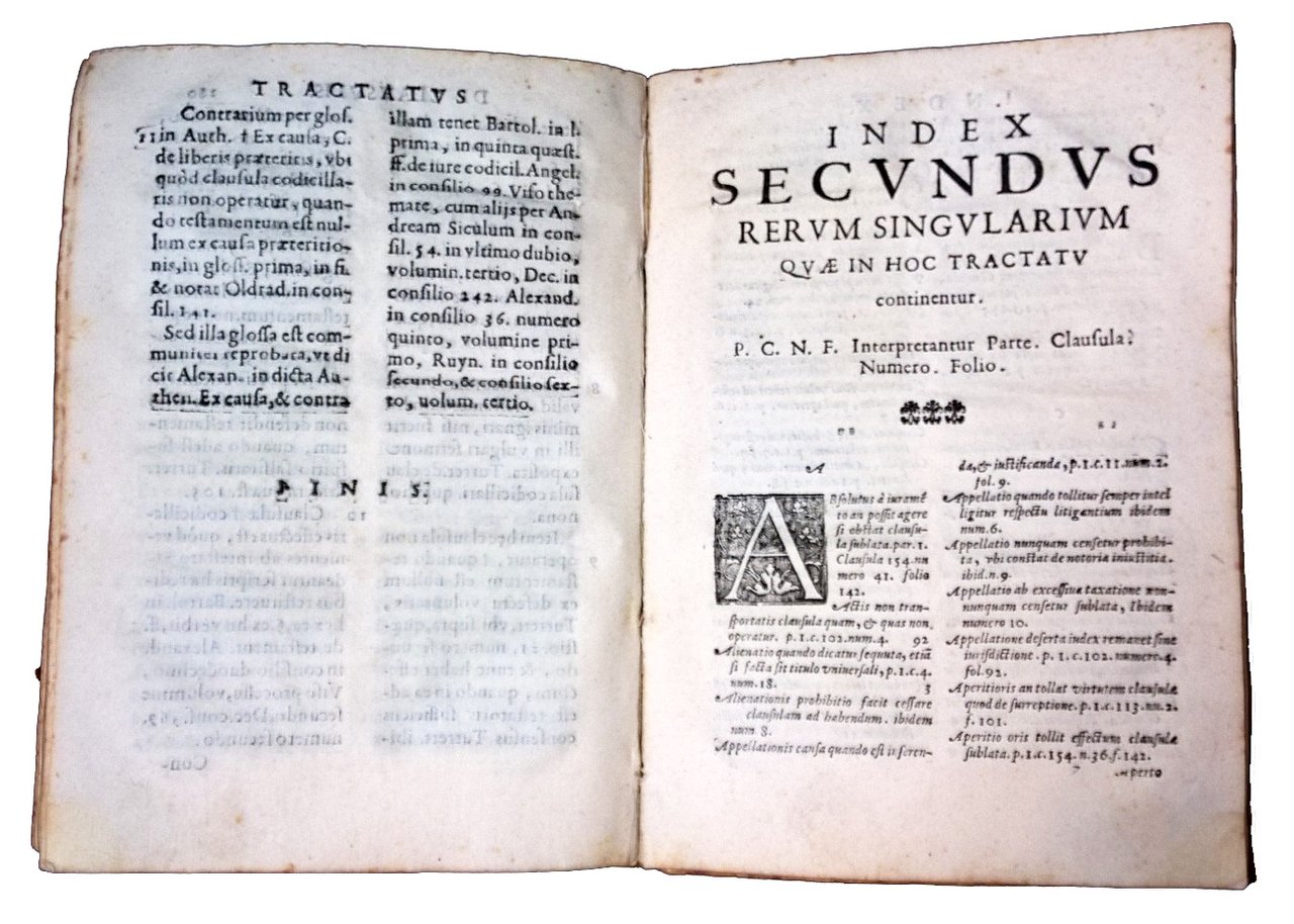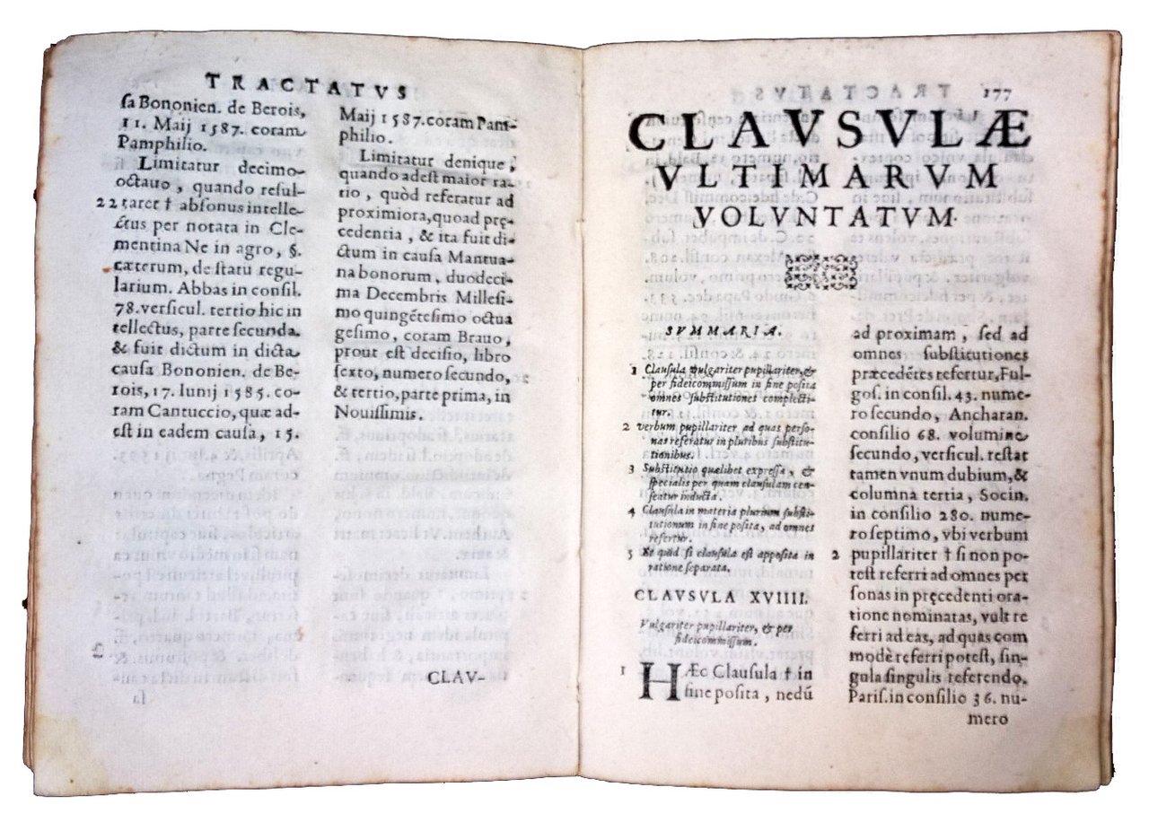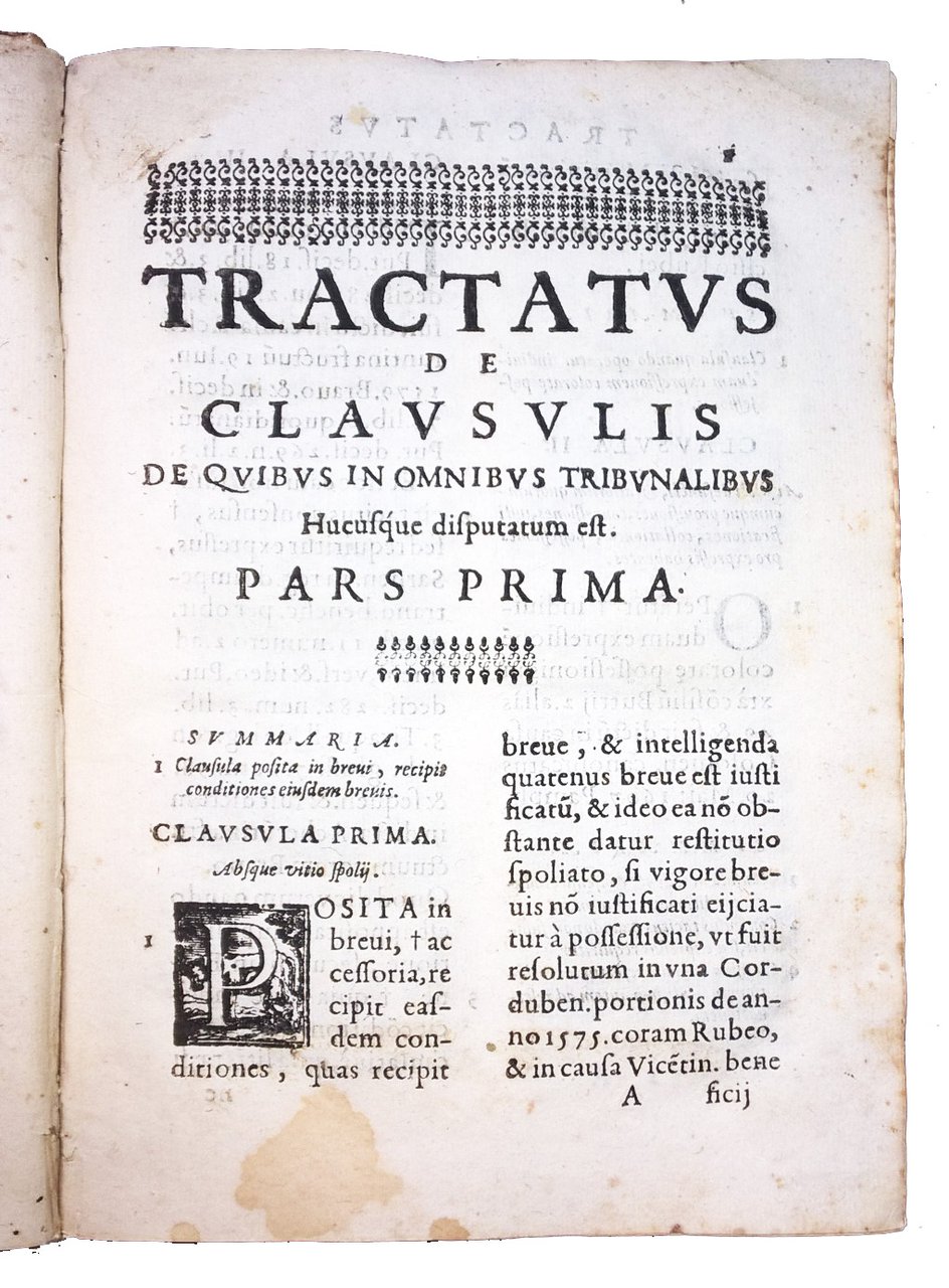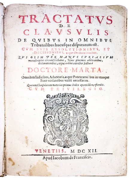 in-4° (214x150 mm), legatura coeva in pergamena morbida, con titolo manoscritto al dorso e resti di lacci di chiusura al bordo laterale dei piatti; carte [4], 180 [i.e. 170], [12]. Numerosi errori ed omissioni nella numerazione delle carte che dovrebbero essere in totale 170. Mancanti in questa copia le carte da 51 a 54 e da 57 a 82. Testo in Latino su 2 colonne. Front. stampato in rosso e nero, con marca tipografica xil. (la Pace seduta con ramoscello di ulivo in mano). Prezioso trattato giuridico sulla legge Romana, raccolta di tutte le clausole discusse nei vari tribunali, con le relative decisioni e dichiarazioni, a cura del giureconsulto napoletano Giacomo Antonio Marta (1559-1628). Rif.: IT\ICCU\BVEE\033566. OCLC, 494710028. Cond.: Tracce d'uso alla legatura (leggere macchie, resti di lacci). Presenza di alcune macchie e occasionali fioriture alle carte; gore d'umido all'agolo inferiore esterno di alcune carte. Opera incompleta (mancanti circa 20 carte), ma comunque in buone condizioni generali. -- Precious legal treatise on the Roman law, collection of all the clauses discussed in the various courts, with the related decisions and declarations, by the Neapolitan jurist Giacomo Antonio Marta. Incomplete copy (missing about 20 leaves), but still in good general condition.