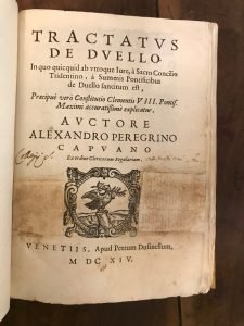 .In quo quicquid ab utroque Iure, à Sacro Concilio Tirdentino, à Summis Pontificibus de Duello sancitum est, Paecipuè verò Constitutio Clementis V III. Pontf. Maximi accuratissimé explicatur. Trattato sul duello nel Seicento ad opera di questo teologo di Capua. Marca tipografica al frontespizio e bei capilettera xilografici di diverse dimensioni. Restauro d'epoca, con integrazioni di parti mancanti, al frontespizio, bruniture ad alcune pagine, piccola galleria di tarlo al margine esterno da pag. 177 a 198 senza compromissione di testo. Legatura (e sguardie) rifatta con pergamena coeva. Nel complesso buon esemplare. Pagg. 26 nn, 232. Piena pergamena. Mis mm 225x160