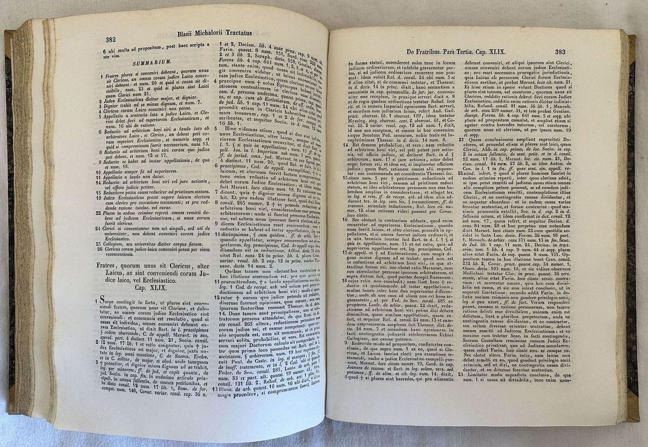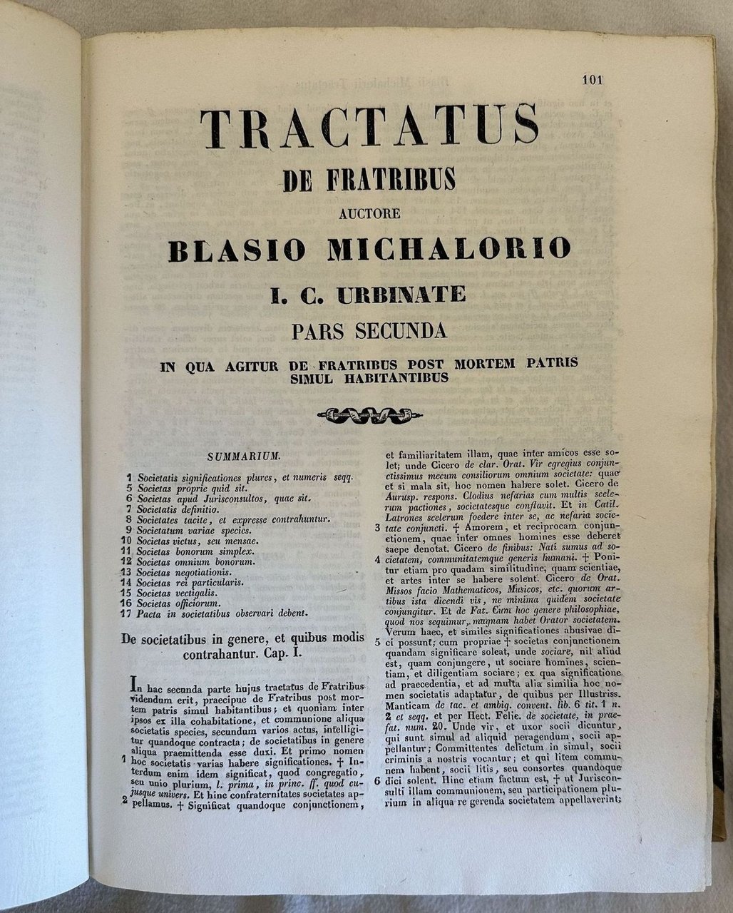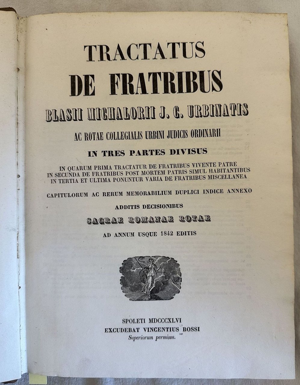 Edizione del 1846 di questo celebre opera del giurista e letterato urbinate Biagio Micalori (n. 1579).<BR><BR>L'opera di diritto familiare riguarda principalmente la situazione giuridica dei fratelli in vari ambiti: testamentario, criminale, ereditario, societa di beni, primogenitura ecc.<BR><BR> <BR><BR>Alla fine decisioni della Sacra Romana Rota pubblicate fino all'anno 1842.<BR><BR>In ottime condizioni e completo.<BR><BR>Copertina in mezza pelle con titolo e decorazioni in oro al dorso in ottime condizioni generali con lievi usure ai margini e dorso. Legatura in buone condizioni. All'interno le pagine si presentano in buone condizioni con fioriture. In 4. Dim. 29x22,5 cm. Pp. (8)+459+(1)+186+(2).Edition of 1846 of this famous treaty by the jurist and letterate from Urbino Biagio Micalori (n. 1579).<BR><BR>Inside the following treaties de Fratribus, de Positionibus, De caeco surdo & muto.<BR><BR>The frist one of family right simply relate the juridical situation of brother sin different issues: witnesses, heredity, society of goods, first son ecc.<BR><BR>at the end decisions of Sacra Romana Rota published until tje year 1842.<BR><BR>In very good conditions and complete.<BR><BR>Half leather coeval cover with gilted title in the spine in very good conditions lightly worn in the edges. Binding in good conditions. Pages in good conditions with foxing. In 4. Dim. 29x22,5 cm. Pp. (8)+459+(1)+186+(2).