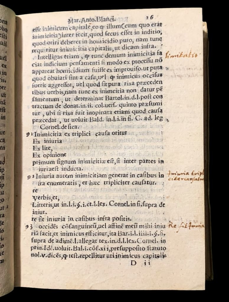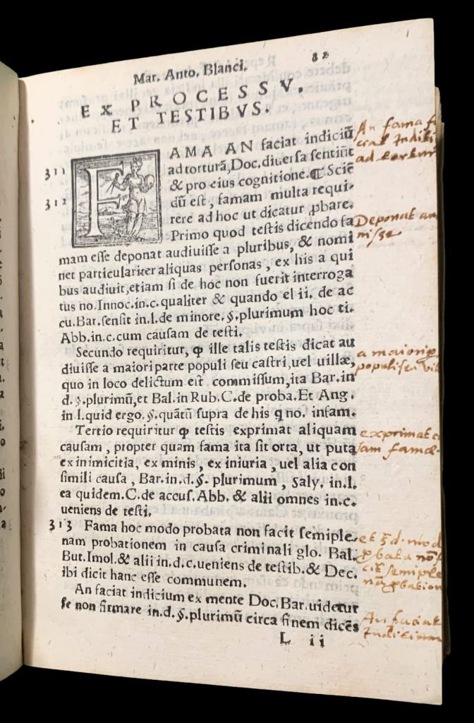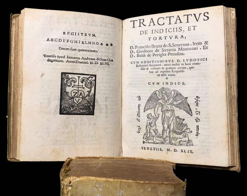 In 12°; 112, (16) cc. e (12), 64 cc (su 96 cc. mancano le carte dopo carta 64). Legatura seicentesca in piena pergmanena rigida con titolo manoscritto al dorso da mano coeva. Un piccolo ed ininfluente tarletto al margine interno bianco superiore, ininfluente. Antica serie di note bibliografiche seicentesche ed ottocentesche alla prima carta binaca. Antica firma di appartennza privata alla prima carta bianca. Numerossisime note cinquecentesche chiosate a mano a lato del testo. Esemplare in ottime condizioni di conservazione. Al primo volume bella marca tipografica al frontespizio con albero sul quale si arrampica un putto mentre un altro cade tenendo in manoun ramo spezzato e motto "Noli altum sapere sed time", al clophon cuore con croce doppia ed iniziali "Z.A.V.". La prima opera è un'importante trattato del giurista padovano, Marcantonio Bianchi (1498-1548) dedicato al diritto penale in caso di omicidio o furto. La seconda opera, dedicata alla tortura è scompleta. Rif. Bibl.: per la prima opera IT\ICCU\NAPE\067601; per la seconda opera UNIMORE F.A.0446.