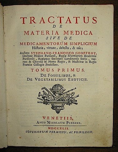 Tractatus de materia medica sive de medicamentorum simplicium Historia, virtute, delectu, & usu. Tomus primus De fossilibus, & De vegetabilibus exoticis (e Tomus secundus De vegetabilibus indigenis)