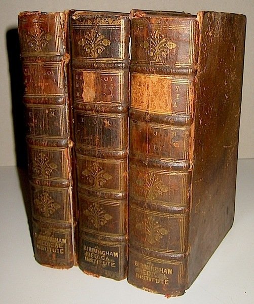 8vo (cm. 19), 3 Voll., 2 cc.nn., 318 pp., 3 cc.nn. con una tav. rip. f.t.; 1 c.n., 794 pp., 3 cc.nn., 1 c.nn., 836 pp. Legature coeve in piena pelle con nervi e fregi oro al ds. Mancanze ai tasselli, cuffie danneggiate, tracce di usura e cerniere molto deboli. Buoni interni. Rara prima edizione. Provenienza: Birmingham Medical Institute (scritta in oro al piede dei ds.). Blake, p. 172.