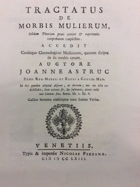 In-8 gr. (mm. 242x175), cartonato rustico coevo, pp. XXIV,388, con 1 tav. inc. in rame fuori testo e più volte ripieg., che contiene 4 figure (dettagliatamente descritte). Interessante è il catalogo cronologico dei medici che scrissero sulle malattie delle donne, diviso in 4 epoche, da Ippocrate a Fitz-Gerald Gerardo (1758). "Prima edizione latina" della prima parte de ce traité remarquable par un grand luxe d'érudition. On y trouve une description fort succincte des organes de la génération de la femme, et une histoire assez commplète de l'art des accouchemens. Così Biographie Médicale,I, p. 403.Il francese Jean Astruc (1674-1766) che fu professore di anatomia a Parigi, è noto soprattutto per il suo "De Morbis Venereis" (1736). Fu uno dei massimi esperti nel campo delle malattie femminili e particolarmente dei tumori; primo medico del re di Polonia, fu consulente di Luigi XV.Cfr. Wellcome,II, p. 65 che cita anche la seconda parte del 1783.Con uniformi lievi arross. e fiorit. ma buon esemplare.