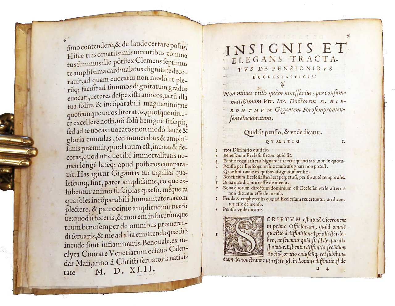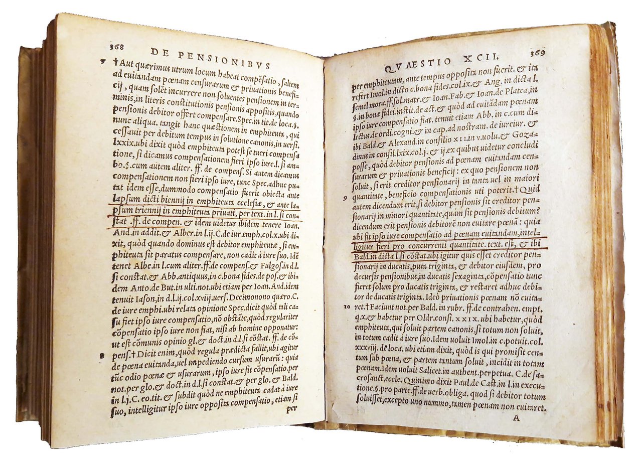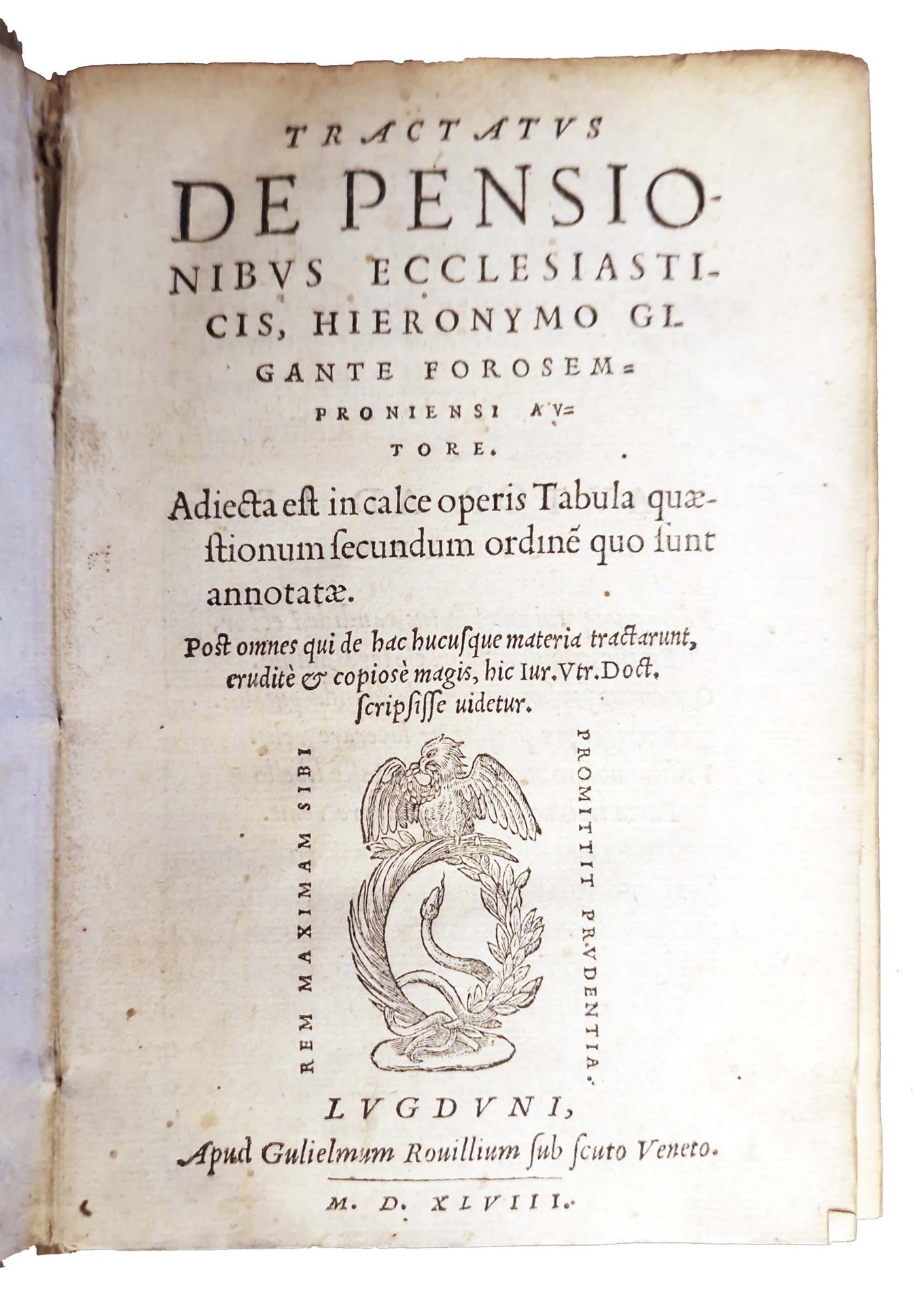 in-8°, 152x104 mm, leg. in pergamena morbida, con titolo manoscritto al dorso; pp. 429, [49]. Bianche le carte D8, 2c7-8. Colophon a carta D7v. Marca editoriale al frontespizio (Corona con ramo di alloro e palma, sopra aquila, dentro corona serpente si alza minaccioso. Motto: rem maximam sibi promittit prudentia). Iniziali xilografiche. Edizione lionese di questo trattato sulle pensioni degli ecclesiastici, pubblicato in prima edizione nel 1542 a Venezia, a cura di Girolamo Giganti, ecclesiastico giurista, proveniente da Fossombrone. Rif.: IT\ICCU\RT1E\009815. OCLC, 46339206. Cond.: Lievi tracce d'uso alla legatura. Carte abbastanza pulite, alcune con fioriture e bruniture marginali. Presenza nel testo di antiche sottolineature di studio. Esemplare molto buono.