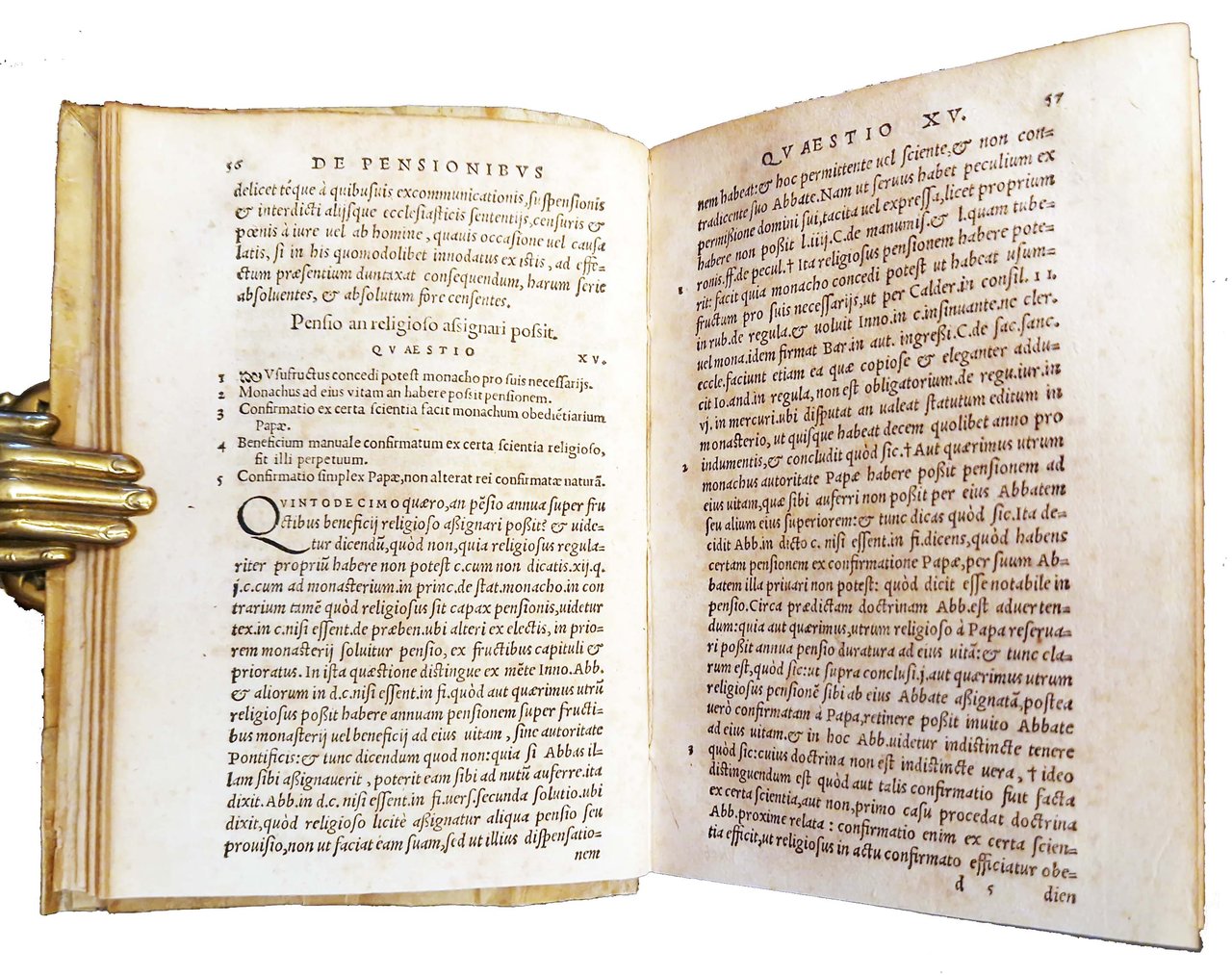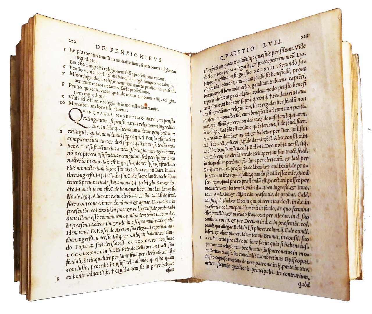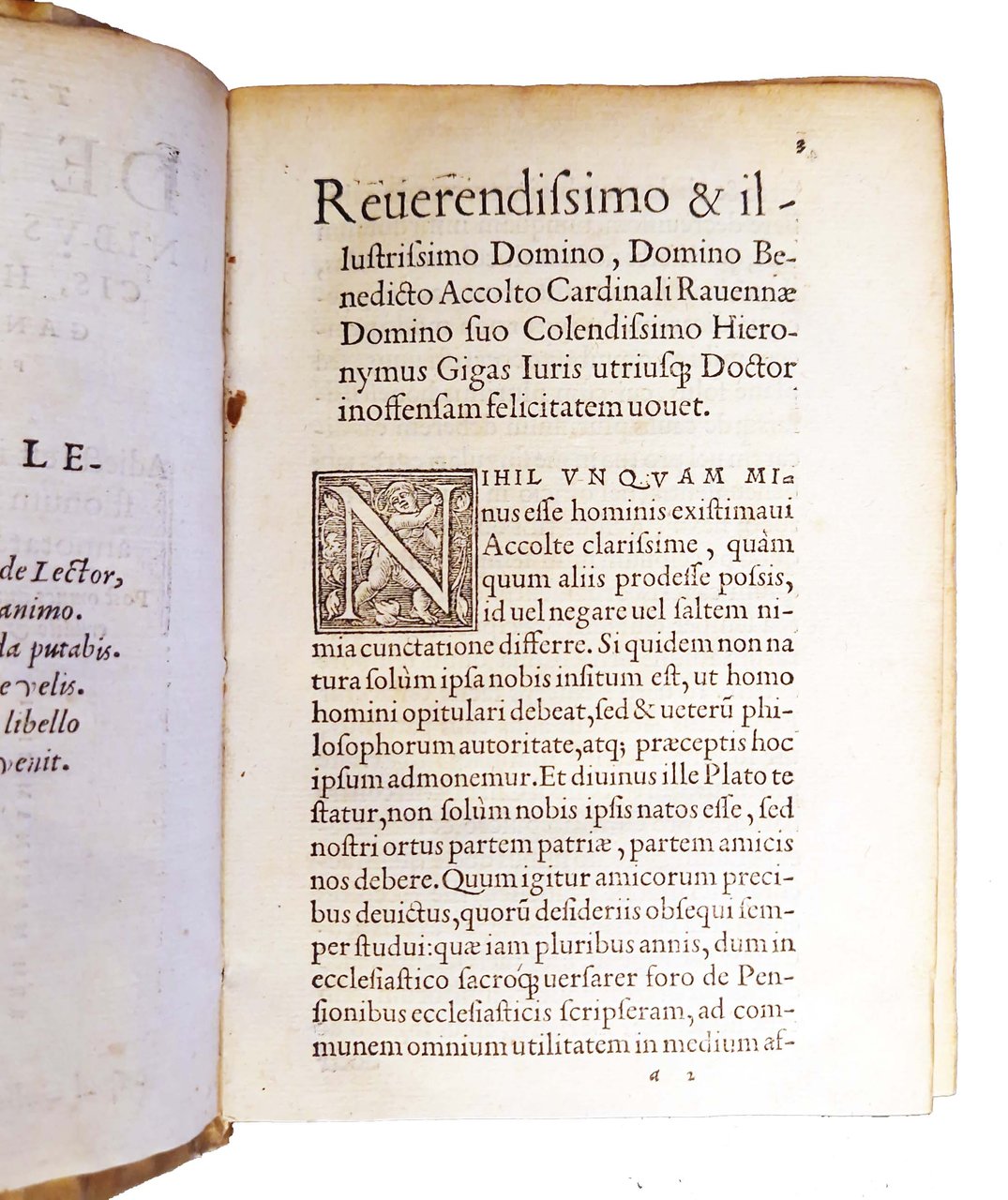 in-8°, 152x104 mm, leg. in pergamena morbida, con titolo manoscritto al dorso; pp. 429, [49]. Bianche le carte D8, 2c7-8. Colophon a carta D7v. Marca editoriale al frontespizio (Corona con ramo di alloro e palma, sopra aquila, dentro corona serpente si alza minaccioso. Motto: rem maximam sibi promittit prudentia). Iniziali xilografiche. Edizione lionese di questo trattato sulle pensioni degli ecclesiastici, pubblicato in prima edizione nel 1542 a Venezia, a cura di Girolamo Giganti, ecclesiastico giurista, proveniente da Fossombrone. Rif.: IT\ICCU\RT1E\009815. OCLC, 46339206. Cond.: Lievi tracce d'uso alla legatura. Carte abbastanza pulite, alcune con fioriture e bruniture marginali. Presenza nel testo di antiche sottolineature di studio. Esemplare molto buono.