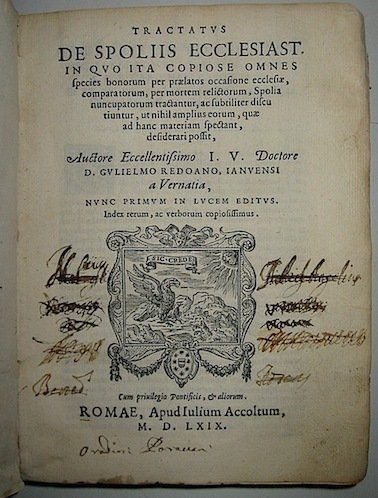 8vo (cm. 21), 4 cc.nn., 487(1) pp.,18 cc.nn. (di 19, manca la carta bianca finale).Bella incisione al frontis. e iniziali figurate. Legatura coeva in piena pergamena parzialmente staccata con titolo (poco leggibile) ms. al ds. Alcuni aloni di sofferta umidità alle prime ed ultime carte Sottolineature di antica mano. Cancellate firme al frontis. Esemplare fresco e a pieni margini. Prima edizione. L’opera di Rodoano è citata da Struvius (Bibliotheca iuris selecta, 1756, p. 616) tra gli scritti sulle vendite dei beni ecclesiastici.