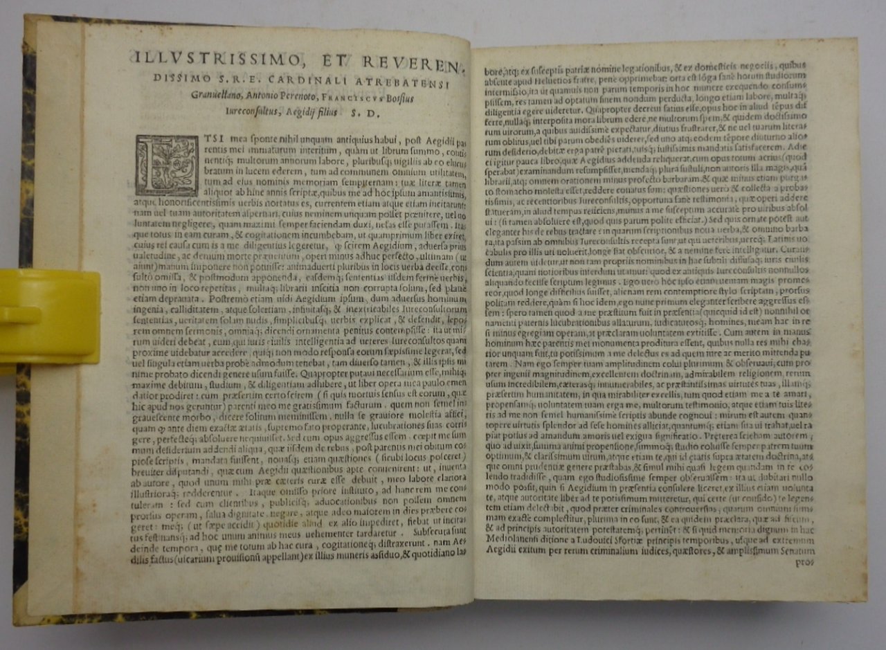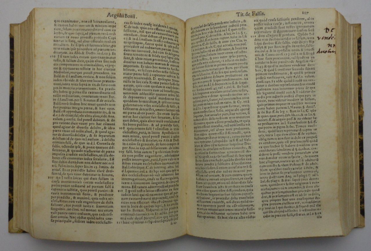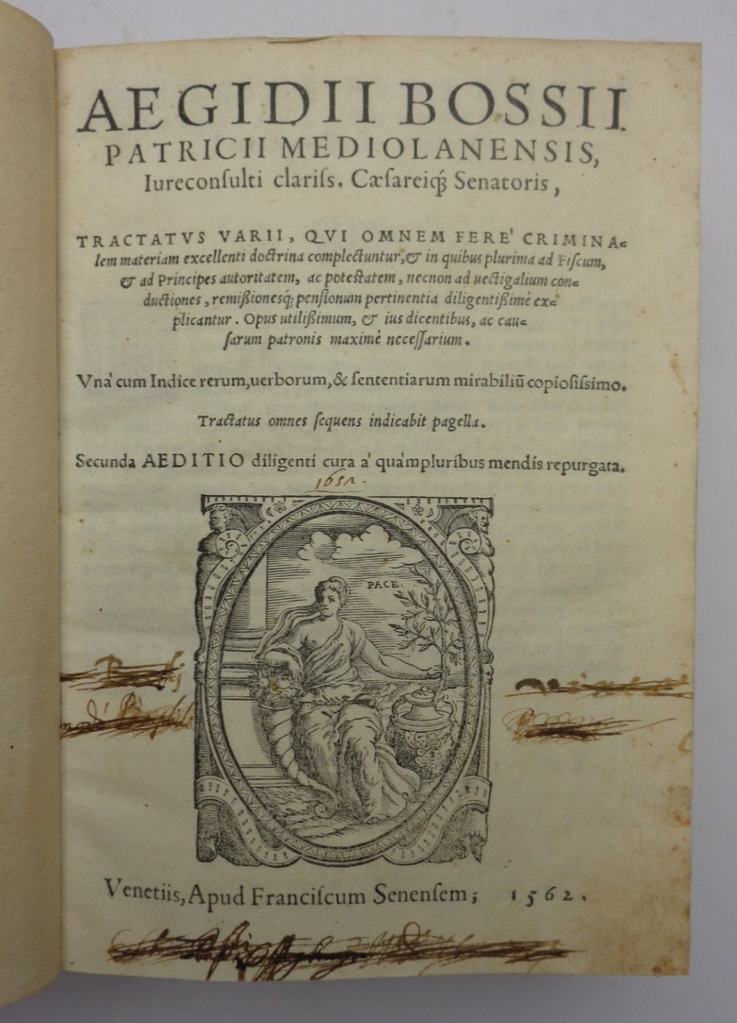 "...& in quibus plurima ad fiscum, & ad principes autoritatem, ac potestatem, necnon ad uectigalium conductiones, remissionesque pensionum pertinentia diligentissime explicantur. Opus utilissimum, et ius dicentibus, ac causarum patronis maximi necessarium. Una cum indice rerum, uerborum, & sententiarum mirabilium copiosissimo. Secunda Aeditio, diligenti cura a quampluribus mendis repurgata". Un volume (14x20,5 cm) di (4)-427-(1)-(91) carte. Marca di editore alla pagina di titolo e al verso dell'ultima numerata. Iniziali xilografiche. Firme di possesso biffate al titolo. Mezza pergamena con titolo manoscritto al dorso. Il lavoro del rilegatore ha tagliato qualche nota manoscritta al margine. Bell'esemplare, in ottime condizioni, di questo importante trattato giuridico. "Opera fondamentale di Egidio Bossi, giurista milanese (1488 - 1546), punto di riferimento obbligato per ogni approccio alla dottrina giuridica milanese, sono i Tractatus varii editi a Venezia nel 1562. Sono più di cento titoli che, illustrando con l'ausilio di pareri illustri e di indubbie decisioni giudiziali le maggiori cause di controversia in tema di diritto penale, compendiano la migliore dottrina criminale del tempo. Cinque dei suoi tractatus si riferiscono direttamente alla tortura: De iudiciis et considerationibus ante torturam; De tortura; De confessis per torturam ac effectu torturae; De tortura testium; De tortura accusatoris. Nel De tortura accusatoris affronta un tema abitualmente sorvolato dagli altri giuristi, circa la consuetudine di sottoporre a tortura l'accusatore; egli al contrario, per ragioni di completezza ("ut nihil pro viribus meis omittatur"), gli dedica un titolo apposito. Nel De iudiciis et considerationibus ante torturam tratta della applicazione della tortura a consiglieri, priori, podestà e funzionari politici in genere, considerati immuni dalla dottrina comune" (DBI, vol 13). Anche P. Fiorelli, La tortura giudiziaria nel diritto comune, Varese 1953, I, p. 160.