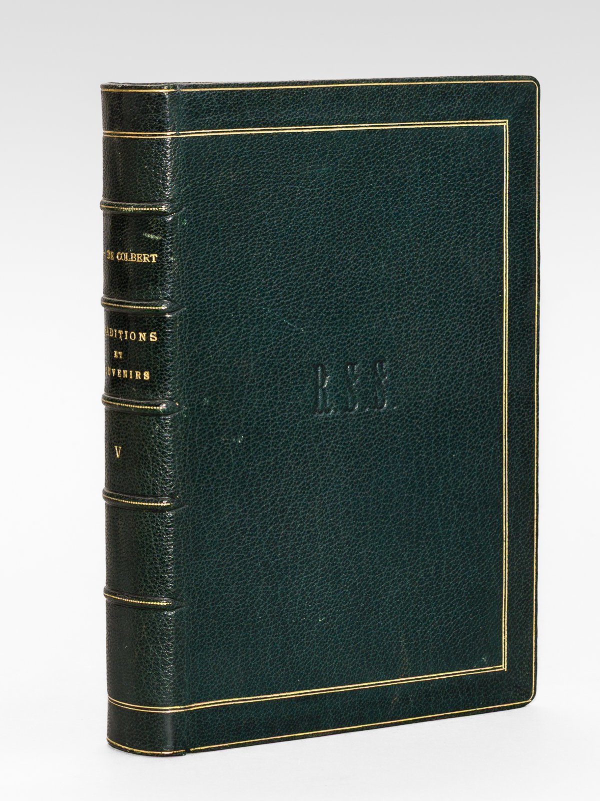 Par N.-J. Colbert, Marquis de Chabanais (son fils), 1 vol. in-8 reliure plein maroquin vert, dos à 5 nerfs dorés, chasses et coupes ornées, double filet doré d'encadrement en plats, tête dorée, initiales R.S.S. (Les Rousselières, Sainte-Suzanne) en plats, Librairie de Firmin Didot Frères, Fils et Cie, Paris, 1873, 492 pp. Tome cinquième seul. Bon état (tome 5 seul, qq. rouss., très bon état par ailleurs) pour ce tome peu commun car paru 10 ans après les trois premiers tomes. Il s'agit d'une biographie "laissée à partir des papiers laissés par le général Colbert de Chabanais" plutôt que de mémoires. La fin du premier volume et tout le second sont consacrés à l'expédition d'Egypte. Les autres concernent les campagnes d'Autriche (1805), de Prusse (1806), de Pologne (1807 puis de la guerre d'Espagne, où Colbert de Chabanais mourra au combat. Tulard, 388