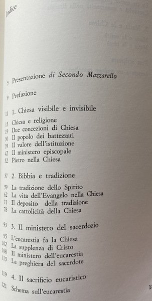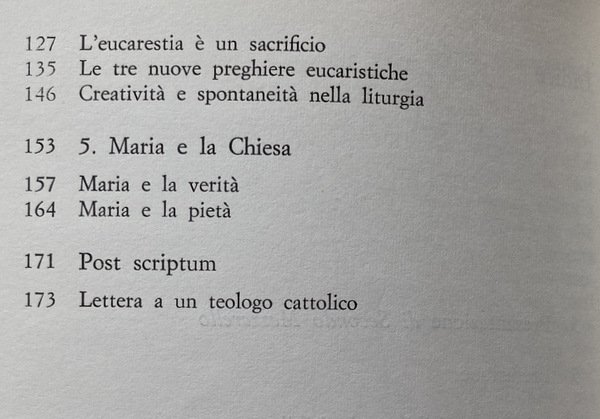 È cosi che, incorniciati da una breve «Premessa» e da una più diffusa e sempre attuale «Lettera a un teologo cattolico», son raccolti nel volume cinque capitoli o «argomenti» rispettivamente su Chiesa visibile e invisibile, Bibbia e tradizione, Ministero sacerdotale, Sacrificio eucaristico, Maria e la Chiesa.