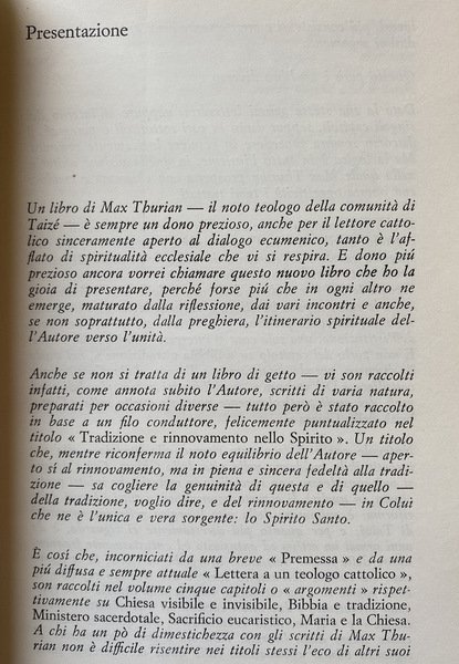 Un libro di Max Thurian - il noto teologo della comunità di Taizé sempre un dono prezioso, anche per il lettore cattolico sinceramente aperto al dialogo ecumenico, tanto è l'afflato di spiritualità ecclesiale che vi si respira. E dono più prezioso ancora vorrei chiamare questo nuovo libro che ho la gioia di presentare, perché forse più che in ogni altro ne emerge, maturato dalla riflessione, dai vari incontri e anche, se non soprattutto, dalla preghiera, l'itinerario spirituale del l'Autore verso l'unità.