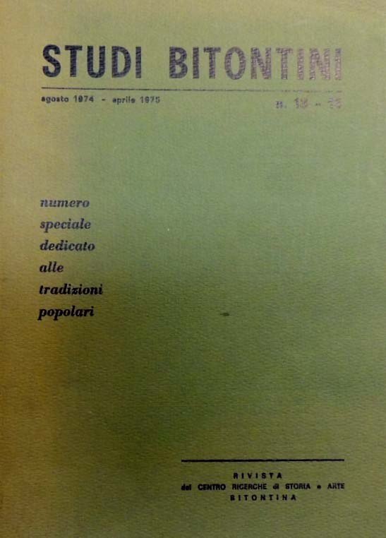 Tradizioni popolari bitontine. Raccolte dagli alunni delle scuole elementari e medie, presentazione di Vincenzo Valente, nota introduttiva di Gaetano Muschitiello, Centro ricerche di storia e arte bitontina, Bitonto 1975, pp. XV-323, ill. b.n., 16 c. di tavv. f.t. b.n., cm 24, br. ed. Numero speciale dedicato alle tradizioni popolari di Studi Bitontini, rivista quadrimestrale del Centro ricerche di storia e arte bitontina, direttore Antonio Castellano, n. 13-15, agosto 1974 – aprile 1975. Indice: Presentazione - Nota introduttiva - Aneddoti - Brindisi - Cantilene di devozione - Canzoni - Filastrocche - Formule magiche - Formule di saluto - Giochi infantili - Imprecazioni e invettive - Indovinelli - Laude - Motteggi - Motteggi di mestiere - Motteggi di paese - Ninne nanne - Preghiere e invocazioni - Proverbi e modi di dire - Racconti rimati - Raggiri verbali - Scioglilingua - Stornelli - Varie - Notiziario. Segni del tempo alla brossura, per il resto copia più che buona.