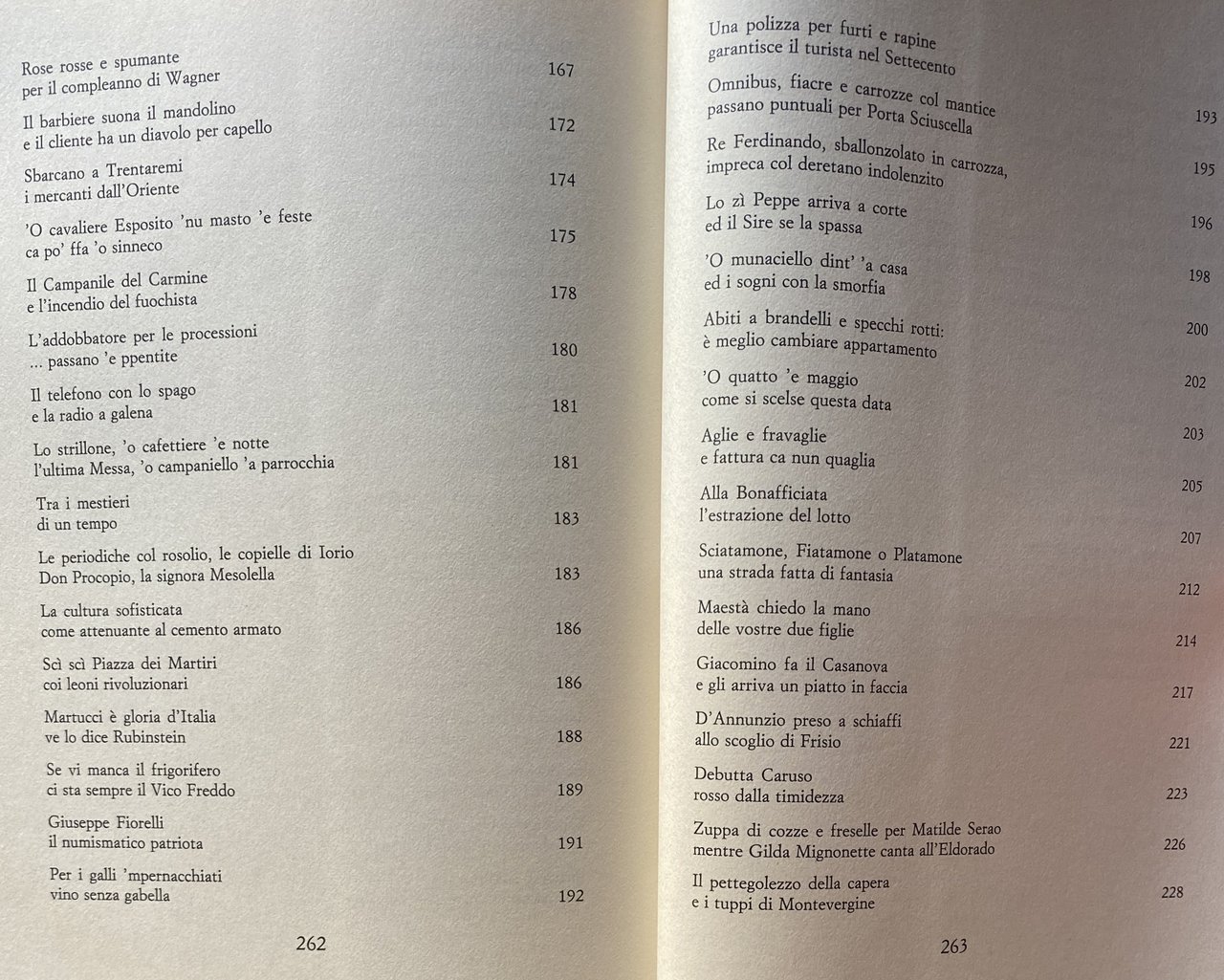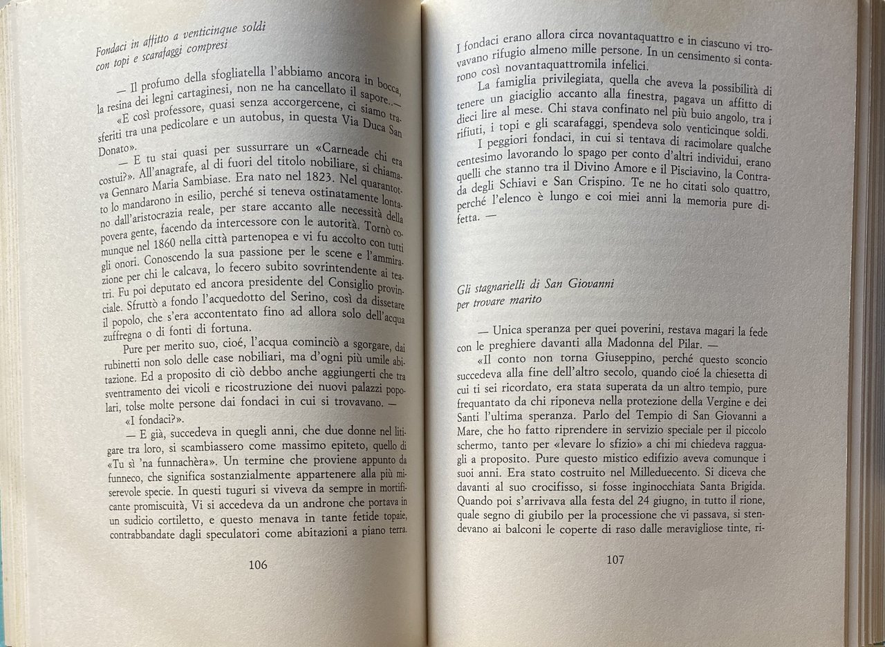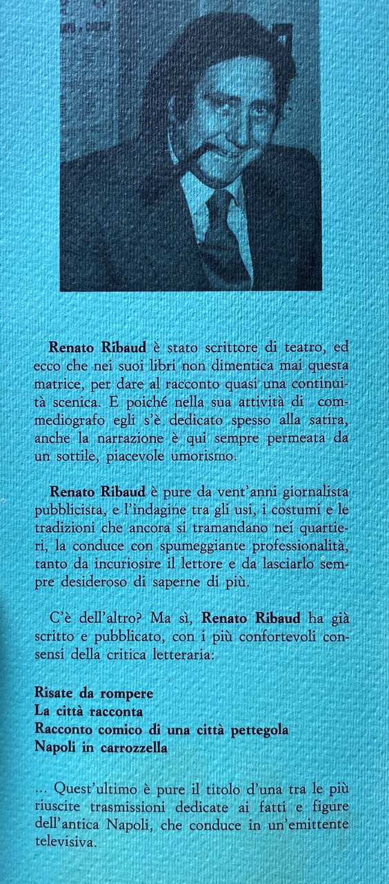 Soggetti: Cultura partenopea Folklore Tradizioni popolari napoletane Musica Canzone napoletana Biografie Vita quotidiana Letteratura Narrativa Collezionismo Libri rari Vintage fuori catalogo Saggi Strade Quartieri Dialetto napoletano Opere dialettali Modi di dire Lingua Gastronomia Società Scienze sociali Studi culturali Aneddotica Curiosità Tradizione Racconti brevi Aneddoti Mario Stefanile Matilde Serao Mattino Teatro San Carlo Leggende Usi e costumi Città Lammatari Feste popolari San Gennaro Piedigrotta Posillipo Borbone Scugnizzi Mergellina Chiaia Vergini Sanità Centro storico Artigiani Alfonso Maria de' Liguori Lotto Numeri Presepe Benedetto Croce Intellettuali Pignasecca Mercati Toledo Martiri Rivoluzione Zuppa di cozze Scoglio di frisio Caruso Re Ferdinando Munaciello Fontanelle Cimitero Anime Pezzentelle Esoterica Esoterismo Mistero Guide letterarie Giuseppe Fiorelli Martucci Pizza Ferdinando Russo Salvatore Di Giacomo poesia Poeti Umorismo San Gregorio Armeno Vomero San Martino Salite Scale Scorci Panorama Parchi Bagnoli Virgiliano capri Procida Ischia Vedute Mare Piazza Plebiscito Storia Eduardo De Filippo Totò Peppino Nicolardi Vicoli Bassi Quartieri spagnoli Le voci dei venditori Le strade della città Lo strummolo a tiriteppola La gasosa col pallino Le guarattelle I lumi di Padre Rocco Il pazzariello L'ammolaforbece 'O 'mpagliasegge 'A Nave San Giorgio 'O masto 'e feste L'incendio al Carmine I cavalli di Monsignor Perrelli Il porco di Sant'Antonio 'A vecchia 'o carnevale Le pizze oggi a otto Come nacque la margherita La smorfia 'O munaciello O quatto 'e maggio Aglio e fravaglie La capera I tuppi di Montevergine Acqua zuffregna al Chiatamone 'O triatro 'e donna Peppa La scola cavaiola La 'Nzegna capa 'e Napule Marianna 'a La mazzarella di San Giuseppe La processione delle quarantore Lo struscio per Toledo 'E carre 'e Piererotta I pranzi di Monzù Testa I figurari di San Gregorio Core cuntento 'a loggia Con Razzullo e Sarchiapone O zampugnaro 'nammurato 'A 'nferta e 'o canisto 'E ttombole Gli ultimi pianini Sapunaro robba vecchia I fondaci Gli stagnarielli per San Giovanni E ppentite I barbieri col mandolino Gli strilloni O cafettiere 'e notte O campaniello 'a parrocchia Le periodiche col rosolio I galli 'mpernacchiati Le antiche osterie Le carrozze col mantice Lo 'zi Peppe a corte Il portavoce O panaro Le fontane che cantavano prima funicolare La Le riggiole a pianoforte Oracolo della Sibilla Le trombette dei giornalai Claudio Nerone Rose rosse e spumante A mezzanotte se sparano e botte Pulcinella senza laurea Palazzo di Capodimonte Salone Margherita La duchessa è andata ai fanghi Sbarcano a Trentaremi L'addobbatore per le processioni La cultura sofisticata Una polizza per furti e rapine Lasagne braciole e sanguinaccio Caporale impegna la lama Ciuccio Azione ciack si gira Roberto d'Angiò apre l'Università al popolo Alla Bonafficiata D'Annunzio preso a schiaffi Juan Murci il maiolicaro arabo Per Oil Oilà Galli mpernacchiati Carrozzella Galleria Umberto Café chantant Achille Lauro Domenico Rea Neapolitan culture Neapolitan popular traditions Music Neapolitan song Biographies Daily life Literature Fiction Collectibles Rare books out of print Essays Streets Neighborhoods Neapolitan dialect Dialect works Sayings Language Gastronomy Society Social sciences Cultural studies Anecdotes Curiosities Tradition Short stories Anecdotes Theater Legends Customs and traditions Cities Popular festivals Bourbons Historic center Artisans Kabbalah Numbers Nativity scene Intellectuals Markets Martyrs Revolution Mussel soup King Ferdinand Fountains Cemetery Souls Esoteric Esoterism Mystery Literary guides Poetry Poets Humor Climbs Stairs Glimpses Panorama Parks Views Sea History Alleys Spanish quarters