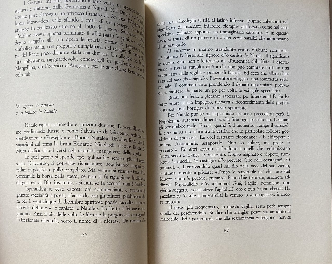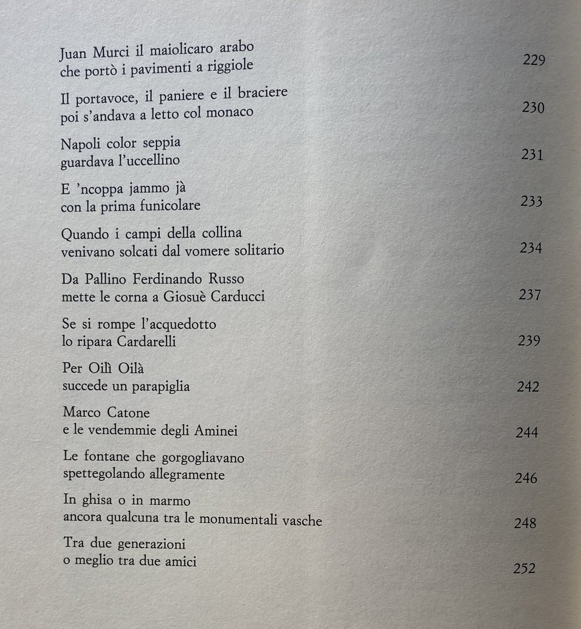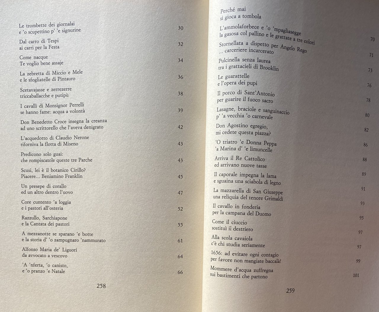 Soggetti: Cultura partenopea Folklore Tradizioni popolari napoletane Musica Canzone napoletana Biografie Vita quotidiana Letteratura Narrativa Collezionismo Libri rari Vintage fuori catalogo Saggi Strade Quartieri Dialetto napoletano Opere dialettali Modi di dire Lingua Gastronomia Società Scienze sociali Studi culturali Aneddotica Curiosità Tradizione Racconti brevi Aneddoti Mario Stefanile Matilde Serao Mattino Teatro San Carlo Leggende Usi e costumi Città Lammatari Feste popolari San Gennaro Piedigrotta Posillipo Borbone Scugnizzi Mergellina Chiaia Vergini Sanità Centro storico Artigiani Alfonso Maria de' Liguori Lotto Numeri Presepe Benedetto Croce Intellettuali Pignasecca Mercati Toledo Martiri Rivoluzione Zuppa di cozze Scoglio di frisio Caruso Re Ferdinando Munaciello Fontanelle Cimitero Anime Pezzentelle Esoterica Esoterismo Mistero Guide letterarie Giuseppe Fiorelli Martucci Pizza Ferdinando Russo Salvatore Di Giacomo poesia Poeti Umorismo San Gregorio Armeno Vomero San Martino Salite Scale Scorci Panorama Parchi Bagnoli Virgiliano capri Procida Ischia Vedute Mare Piazza Plebiscito Storia Eduardo De Filippo Totò Peppino Nicolardi Vicoli Bassi Quartieri spagnoli Le voci dei venditori Le strade della città Lo strummolo a tiriteppola La gasosa col pallino Le guarattelle I lumi di Padre Rocco Il pazzariello L'ammolaforbece 'O 'mpagliasegge 'A Nave San Giorgio 'O masto 'e feste L'incendio al Carmine I cavalli di Monsignor Perrelli Il porco di Sant'Antonio 'A vecchia 'o carnevale Le pizze oggi a otto Come nacque la margherita La smorfia 'O munaciello O quatto 'e maggio Aglio e fravaglie La capera I tuppi di Montevergine Acqua zuffregna al Chiatamone 'O triatro 'e donna Peppa La scola cavaiola La 'Nzegna capa 'e Napule Marianna 'a La mazzarella di San Giuseppe La processione delle quarantore Lo struscio per Toledo 'E carre 'e Piererotta I pranzi di Monzù Testa I figurari di San Gregorio Core cuntento 'a loggia Con Razzullo e Sarchiapone O zampugnaro 'nammurato 'A 'nferta e 'o canisto 'E ttombole Gli ultimi pianini Sapunaro robba vecchia I fondaci Gli stagnarielli per San Giovanni E ppentite I barbieri col mandolino Gli strilloni O cafettiere 'e notte O campaniello 'a parrocchia Le periodiche col rosolio I galli 'mpernacchiati Le antiche osterie Le carrozze col mantice Lo 'zi Peppe a corte Il portavoce O panaro Le fontane che cantavano prima funicolare La Le riggiole a pianoforte Oracolo della Sibilla Le trombette dei giornalai Claudio Nerone Rose rosse e spumante A mezzanotte se sparano e botte Pulcinella senza laurea Palazzo di Capodimonte Salone Margherita La duchessa è andata ai fanghi Sbarcano a Trentaremi L'addobbatore per le processioni La cultura sofisticata Una polizza per furti e rapine Lasagne braciole e sanguinaccio Caporale impegna la lama Ciuccio Azione ciack si gira Roberto d'Angiò apre l'Università al popolo Alla Bonafficiata D'Annunzio preso a schiaffi Juan Murci il maiolicaro arabo Per Oil Oilà Galli mpernacchiati Carrozzella Galleria Umberto Café chantant Achille Lauro Domenico Rea Neapolitan culture Neapolitan popular traditions Music Neapolitan song Biographies Daily life Literature Fiction Collectibles Rare books out of print Essays Streets Neighborhoods Neapolitan dialect Dialect works Sayings Language Gastronomy Society Social sciences Cultural studies Anecdotes Curiosities Tradition Short stories Anecdotes Theater Legends Customs and traditions Cities Popular festivals Bourbons Historic center Artisans Kabbalah Numbers Nativity scene Intellectuals Markets Martyrs Revolution Mussel soup King Ferdinand Fountains Cemetery Souls Esoteric Esoterism Mystery Literary guides Poetry Poets Humor Climbs Stairs Glimpses Panorama Parks Views Sea History Alleys Spanish quarters