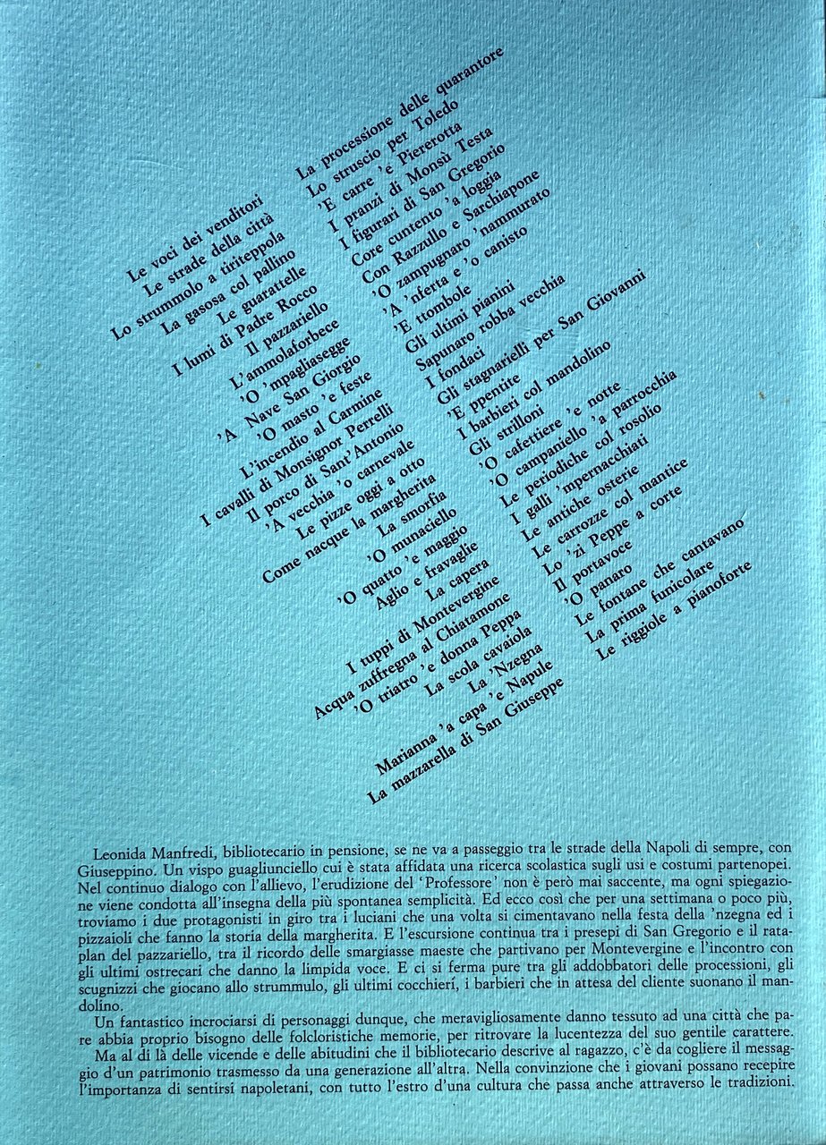 Leonida Manfredi, bibliotecario in pensione, se ne va a passeggio tra le strade della Napoli di sempre, con Giuseppino. Un vispo guagliunciello cui è stata affidata una ricerca scolastica sugli usi e costumi partenopei. Nel continuo dialogo con l'allievo, l'erudizione del Professore non è però mai saccente, ma ogni spiegazione viene condotta all'insegna della più spontanea semplicità. Ed ecco così che per una settimana o poco più, troviamo i due protagonisti in giro tra i luciani che una volta si cimentavano nella festa della 'nzegna ed i pizzaioli che fanno la storia della margherita. E l'escursione continua tra i presepi di San Gregorio e il rataplan del pazzariello, tra il ricordo delle smargiasse maeste che partivano per Montevergine e l'incontro con gli ultimi ostrecari che danno la limpida voce. E ci si ferma pure tra gli addobbatori delle processioni, gli scugnizzi che giocano allo strummulo, gli ultimi cocchieri, i barbieri che in attesa del cliente suonano il mandolino. Un fantastico incrociarsi di personaggi dunque, che meravigliosamente danno tessuto ad una città che pare abbia proprio bisogno delle folcloristiche memorie, per ritrovare la lucentezza del suo gentile carattere. Ma al di là delle vicende e delle abitudini che il bibliotecario descrive al ragazzo, c'è da cogliere il messaggio d'un patrimonio trasmesso da una generazione all'altra. Nella convinzione che i giovani possano recepire l'importanza di sentirsi napoletani, con tutto l'estro d'una cultura che passa anche attraverso le tradizioni.