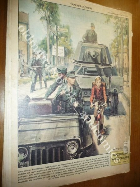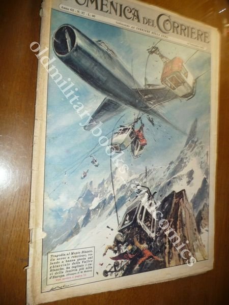 DESCRIZIONE: Domenica del Corriere, Milano, Anno 59 n. 28 (14 LUGLIO 1957). COPERTINA: Tragedia al Monte Bianco. Un aereo a reazione sul ghiacciaio della Vallèe Blanche trancia i cavi della funivia più alta d'Europa RETRO: Scorta d'eccezione per un bambino per raggiungere la scuola situata in territorio sovietico. La Domenica del Corriere è stato un popolare settimanale italiano fondato a Milano nel 1899 e chiuso nel 1989. Apparve per la prima volta nelle edicole l'8 gennaio 1899 come supplemento illustrato del Corriere della Sera. Stampata in grande formato (sul modello del domenicale La Tribuna illustrata), aveva 12 pagine e veniva distribuita gratis agli abbonati del Corriere, oppure si poteva acquistare in edicola per 10 centesimi. La prima e ultima di copertina erano sempre disegnate. Il Corriere si avvaleva di un giovane disegnatore, Achille Beltrame, allora sconosciuto, a cui veniva affidato in ogni numero il compito di rendere con la sua tavola il fatto più interessante della settimana. Dopo la sua morte nel 1945, fu sostituito da Walter Molino che, come il suo predecessore, firmò memorabili copertine. A differenza dei settimanali dell'epoca, la Domenica del Corriere diede ampio spazio alle fotografie e ai disegni, e questo fu uno dei motivi del suo successo. CONDIZIONI: Discerte/Buone senza azzurrina pieghe con strappi e piccola mancanza al retro. PESO / WEIGHT: 200 gr. without package