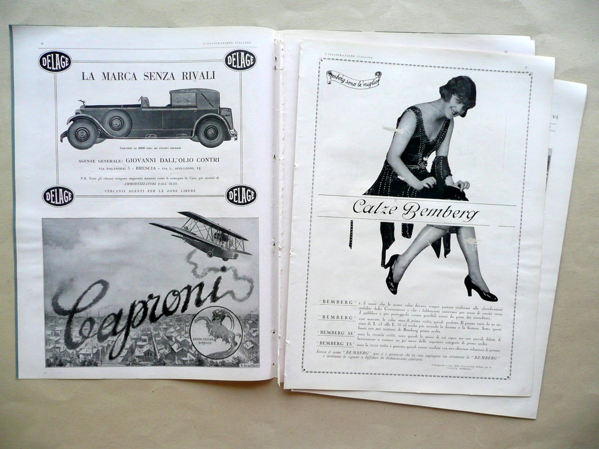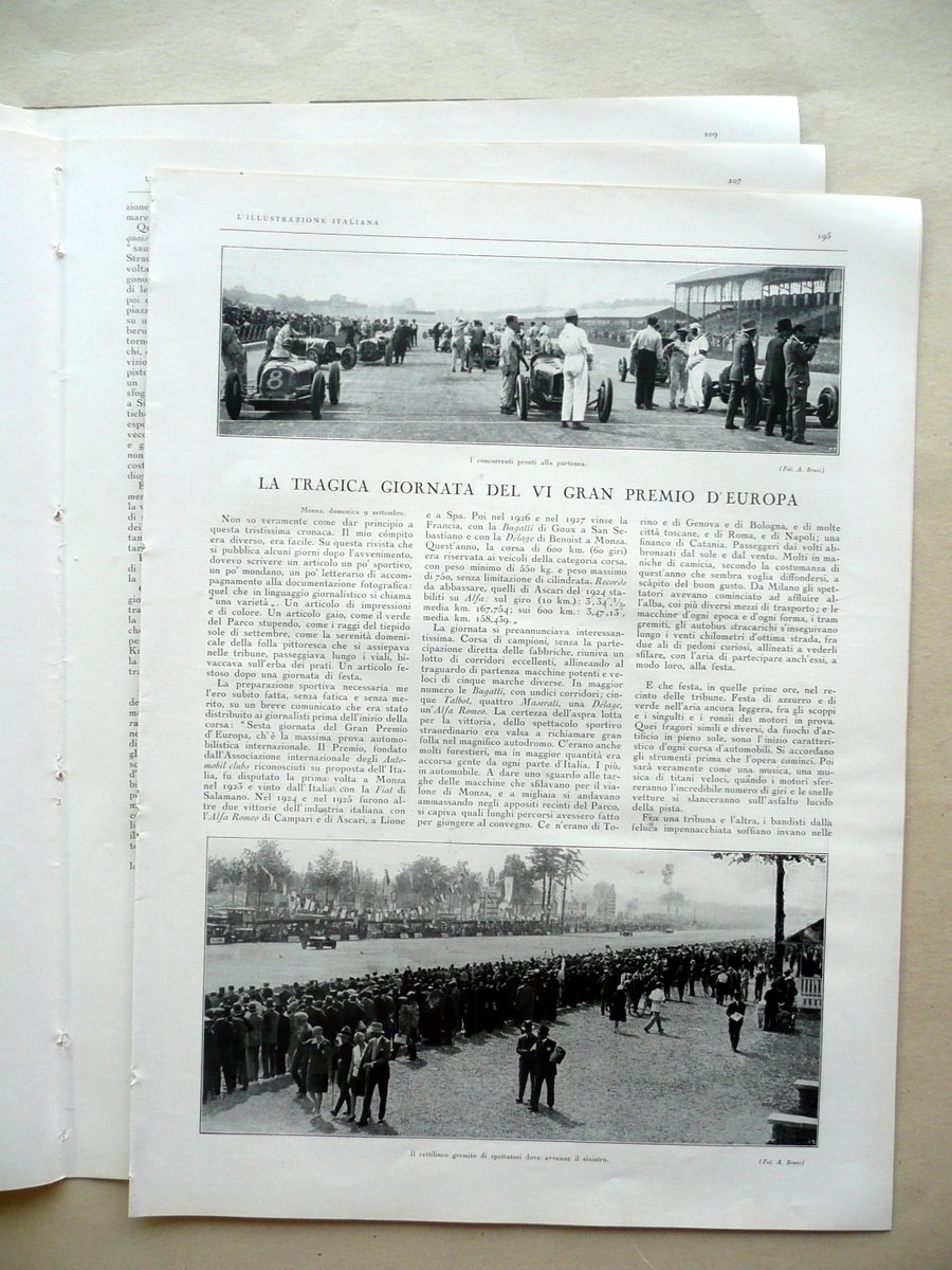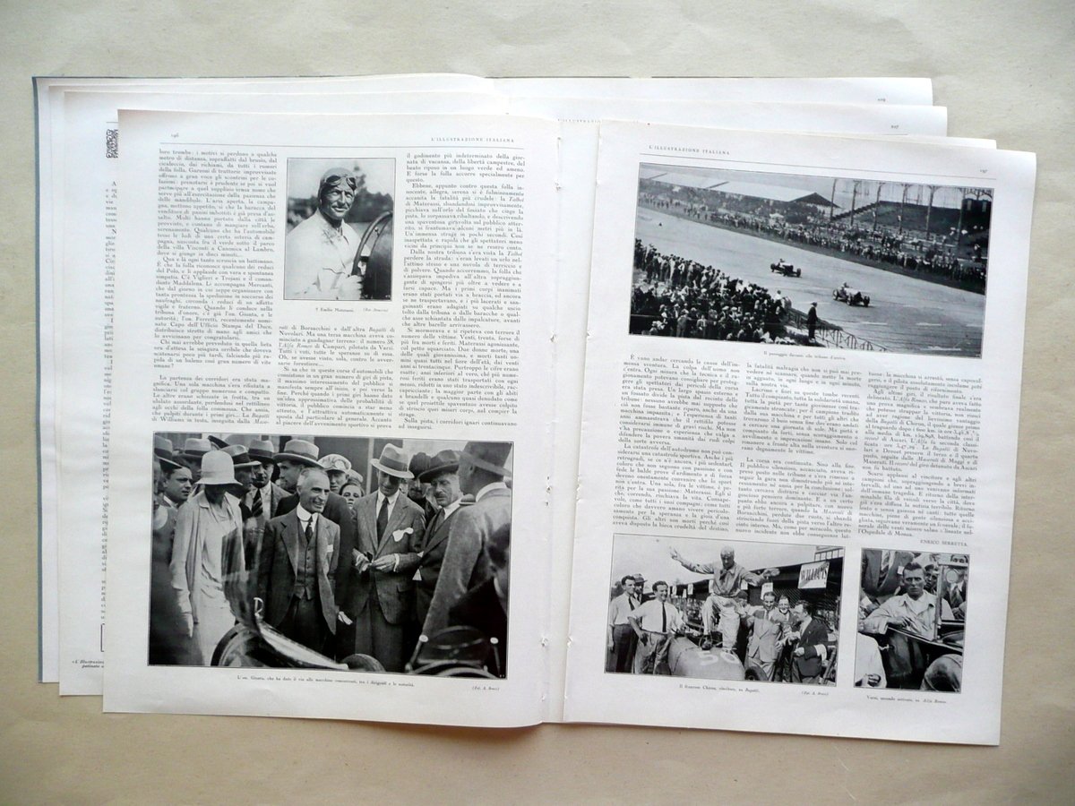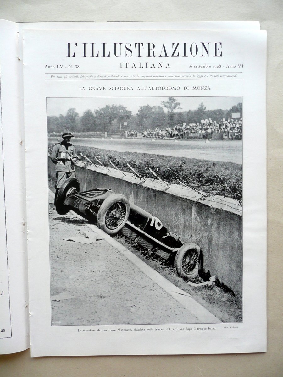 Settimanale, La tragica giornata del VI Gran Premio d'Europa" Articolo di Enrico Serretta in "L'Illustrazione Italiana" Anno LV - Numero 38 Milano, 16 Settembre 1928 F.lli Treves, Milano 1928, cm 38,5x29, pp. XII; da pagina 193 a pagina 212 con numerose ill. fotogr. in b/n nel t. (qualcuna anche fuori t.); brossura ed. (ma esemplare a fogli sciolti). Condizioni di conservazione Esemplare complessivamente ben conservato con tracce d'uso; margini lievemente rifilati; dorso con una circoscritta mancanza, alcuni piccoli strappetti e qualche forellino per precedente inserimento delle cuciture (esemplare in precedenza inserito entro volume). Interni buoni; mancanza delle pp. III-IV (corrispondenti a due inserzioni pubblicitarie fuori testo); pagina V con qualche piccola leggera abrasione da distacco. Lungo articolo di 3 pagine sul tragico incidente automobilistico avvenuto durante il VI Gran Premio d'Europa (Autodromo di Monza), nel quale il pilota Emilio Materassi sbandò e piombò su un gruppo di spettatori, causando la morte di una ventina di persone (lo stesso Materassi morì poco dopo l'incidente, a causa delle ferite riportate). L'articolo è corredato da alcune illustrazioni fotografiche in bianco e nero, tra le quali quelle del primo e del secondo classificato (nonostante l'incidente la gara proseguì fino alla fine): Chiron su Bugatti, e Varzi su Alfa Romeo. La pagina 193 è occupata da una grande illustrazione fotografica in bianco e nero dell'auto di Materassi incastrata nella trincea del rettilineo, dopo l'incidente. SC03.D10999 N F bis "