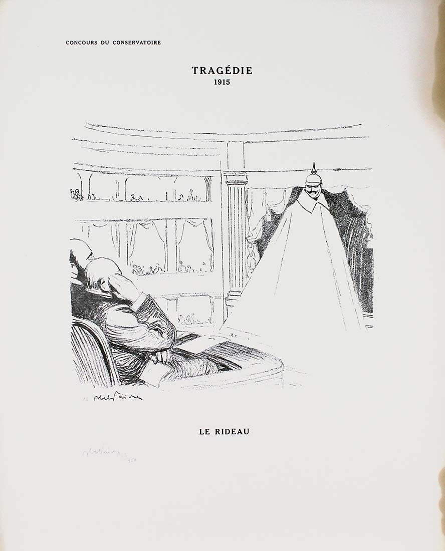 Abel Jules Faivre (Lione 1867 - Nizza 1945) Litografia originale firmata a mano dall'artista.Dimensioni: 56 x 38,5 cmCon certificato di autenticità C.O.A.Ingiallimento laterale come da foto.Esemplare numero 62/250 La raccolta di litografie umoristiche del caricaturista francese Abel Faivre (Lione 1867-Nizza 1945), andata a confluire nel volume Jours de guerre,fu pubblicata in due tomi tra il 1915 e il 1919. Con il procedere del conflitto, l'opinione pubblica di tutti i paesi coinvolti,che aveva dapprima affrontato tale evento con ottimismo, mutò rapidamente opinione sino a considerare la guerra, senza mezzi termini,come un avvenimento rovinoso. In tale contesto, le vignette satiriche di guerra possedevano un potente effetto catartico,adempivano un ruolo sociale irrinunciabile, fornendo una valvola di sfogo all’incombere dal più cupo pessimismo. Abel Jules Faivre (Lyon 1867 - Nizza 1945) Originale Lithographie vom Künstler von Hand signiert.Abmessungen: 56 x 38,5 cmMit Echtheitszertifikat C.O.A.Seitliche Vergilbung wie auf dem Foto.Kopieren Sie die Nummer 62/250 Die Sammlung humorvoller Lithographien des französischen Karikaturisten Abel Faivre (Lyon 1867-Nizza 1945), die in den Band Jours de guerre floss,es wurde zwischen 1915 und 1919 in zwei Bänden veröffentlicht. Im Verlauf des Konflikts wurde die öffentliche Meinung in allen beteiligten LändernWer dieses Ereignis anfangs mit Optimismus konfrontiert hatte, änderte schnell seine Meinung, um den Krieg ohne Zweifel zu betrachten.wie ein ruinöses Ereignis. In diesem Zusammenhang hatten die satirischen Kriegskarikaturen eine starke kathartische Wirkung.Sie erfüllten eine unverzichtbare soziale Rolle und bildeten ein Entlastungsventil gegen den dunkelsten Pessimismus. Abel Jules Faivre (Lyon 1867 - Nice 1945) Lithographie originale signée à la main par l'artiste.Dimensions: 56 x 38,5 cmAvec certificat d'authenticité C.O.A.Jaunissement latéral comme sur la photo.Copie numéro 62/250 La collection de lithographies humoristiques du caricaturiste français Abel Faivre (Lyon 1867-Nice 1945), qui allait se fondre dans le volume Jours de guerre,il a été publié en deux volumes entre 1915 et 1919. À mesure que le conflit progressait, l'opinion publique de tous les pays impliqués,qui avait d'abord fait face à cet événement avec optimisme, a rapidement changé d'avis pour envisager la guerre, en termes non équivoques,comme un événement ruineux. Dans ce contexte, les caricatures de guerre satiriques ont eu un puissant effet cathartique,ils remplissaient un rôle social indispensable, fournissant une soupape de décharge du pessimisme le plus sombre. Abel Jules Faivre (Lyon 1867 - Nice 1945) Original lithograph signed by hand by the artist.Dimensions: 56 x 38.5 cmWith certificate of authenticity C.O.A.Lateral yellowing as in the photo.Copy number 62/250 The collection of humorous lithographs by the French caricaturist Abel Faivre (Lyon 1867-Nice 1945), which went to flow into the volume Jours de guerre,it was published in two volumes between 1915 and 1919. As the conflict progressed, public opinion in all the countries involved,who had initially faced this event with optimism, quickly changed his opinion to consider the war, in no uncertain terms,like a ruinous event. In this context, the satirical war cartoons had a powerful cathartic effect,they fulfilled an indispensable social role, providing a relief valve from the darkest pessimism.