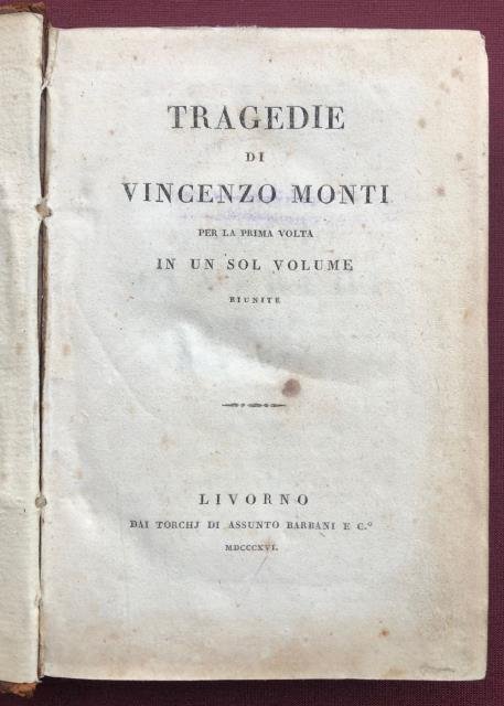 Livorno, dai Torchj di Assunto Barbani e C°., 1816. In 8vo piccolo, pp. 113 (Galeotto Manfredi Principe di Faenza), 102 (Aristodemo), 116 (Cajo Gracco), leg. orig. in piena pelle con fregetti oro al dorso. Imperfezioni alla legatura (una leggera abrasione al piatto anteriore e un leggero distacco del piatto dal dorso) e un fisiologico ingiallimento del tempo, nell'insieme in buono stato di conservazione. Vincenzo Monti (Ravenna, Alfonsine, 1754 – Milano, 1828) poeta, scrittore, traduttore e drammaturgo italiano, ritenuto l'esponente per eccellenza del Neoclassicismo italiano sebbene la sua produzione abbia conosciuto stili mutevoli e sia stata a tratti anche vicina alla sensibilità romantica. .