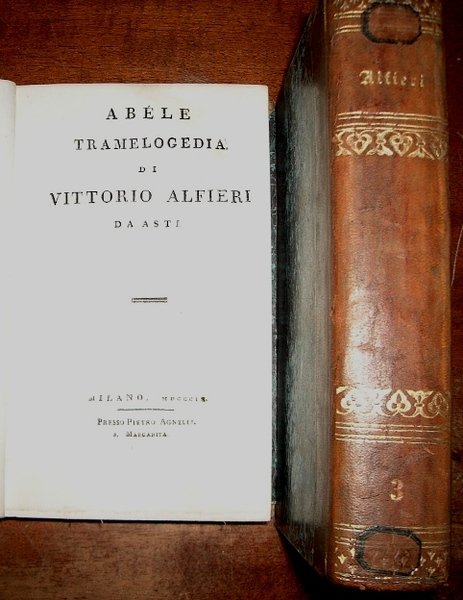 Sette tomi in tre volumi in 8 legati in mezza pelle, titolo ai dorsi, sguardie marmorate (exlibris incollato), occhiello, frontespizi, 253, 251, 267, 281, 288, 286, 220, carte d'indici e di bibliografia editoriale al fondo d'ogni tomo. Per un errore di paginazione, Virginia si trova spostata nel volume secondo. L'arte somma del corrusco Astigiano specchiata nelle sue tragedie e nelle traduzioni dei classici greci. Vette pi alte nell'arte tragica settecentesca italiana non furono toccate ed il Genio alfieriano ben pu posare accanto ai Grandi della Patria che rendon sacra Santa Croce. L'edizione uscita dai torchi di Agnelli, di grande correttezza semantica e di gradevolissima impaginazione, parte dell'opera omnia, ma pu essere ben apprezzata a se stante. In bello stato, di grande leggibilit, assai poco comune.