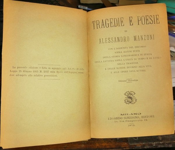 Tragedie e poesie di Alessandro Manzoni con l'aggiunta sopra alcuni punti della storia longobardica in Italia della lettera sopra l'unità di tempo e di luogo nella tragedia e delle notizie intorno alla vita e alle opere dell'autore. Edizione stereotipa.