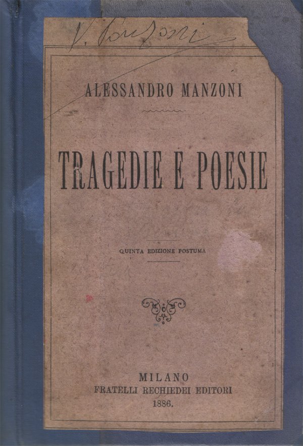 In-16° (cm 17,3x11,2), pp. 334, (2), legatura coeva in tela con normali tracce d'uso (piccola menda nella parte superiore della cerniera anteriore). Con copertina editoriale anteriore applicata al piatto anteriore (vedi foto). Firma d'appartenenza alla copertina anteriore, nota manoscritta coeva a matita viola nella parte superiore del frontespizio. Pagine con normale patina del tempo (leggere arrossature dovute al tipo di carta), per il resto buon esemplare. Indice: Adelchi; Il Conte di Carmagnola; Inni sacri; Strofe per una prima Comunione; Il Cinque Maggio; Marzo 1821; Il Proclama di Rimini; In morte di Carlo Imbonati; Urania.