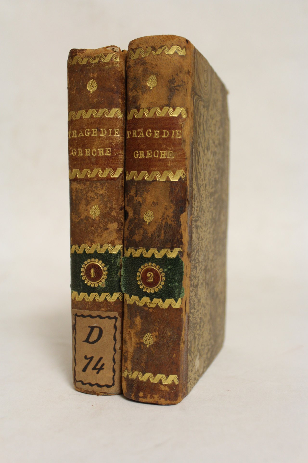 Due tomi in 8° (mm 154x100); pagg. 304, 358; elegante legatura coeva in mezza pelle con doppio tassello al dorso e fregi dorati, piatti marmorizzati. Bella edizione che riporta tutte le tragedie dei tre grandi autori classici greci. Ottimo esemplare con piccole tracce del tempo alla legatura