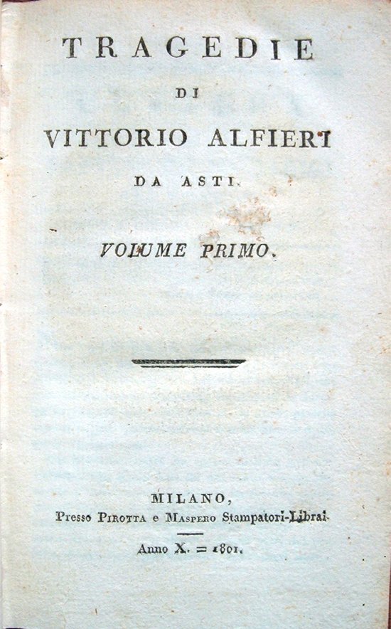 Otto volumi (cinque di Tragedie, tre di Opere varie) in-16° (17,3 x 10,8 cm), pp. 323, (1), 300; 339, (1); 356, (2); 347, (1); VIII, 232; 267, (1); 287, (1), legatura ottocentesca in mezza tela con titoli e fregi in oro al dorso. Tagli a spruzzo. Normali segni del tempo alla legatura. All'antiporta del Volume primo delle Tragedie, tavola fuori testo con ritratto dell'Alfieri inciso su rame da Giovanni Boggi (qualche piccola abrasione e qualche piccolo difetto all'altezza del volto). Nella parte inferiore del contropiatto anteriore di ciascun volume, targhetta pubblicitaria, in carta colorata, di "Luigi Pantalini. Cartolajo e Legatore di Libri d'ogni qualità. Corsia del Giardino 1227 In Milano". Pochi, piccoli restauri, perfettamente eseguiti, in particolare qualche strappetto rimarginato. Normali segni d'uso e del tempo, nel complesso esemplare molto ben conservato. Nota di spedizione: il peso complessivo dei volumi, debitamente imballati per l'invio, supera i 3 chilogrammi. Di seguito, il dettaglio del contenuto dei singoli volumi: Tragedie. Voume primo. Lettera del Calsabigi all'autore; Risposta dell'autore; Parere dell'autore su l'arte comica in Italia; Filippo; Polinice; Antigone. Volume secondo. Virginia; Agamennone; Oreste; Rosmunda. Volume terzo. Ottavia; Timoleone; Merope; Lettera del Cesarotti sulle tre suddette Tragedie; Note dell'autore, che servono di risposta al signor Cesarotti; Maria Stuarda. Volume quarto. La congiura de' Pazzi; Don Garzia; Saul; Agide; Sofonisba. Volume quinto. Bruto primo; Mirra; Bruto secondo; Parere dell'autore su ciascheduna delle presenti tragedie; Su l'invenzione di tutte; Su la sceneggiatura; Su lo stile. Opere Varie filosofico-politiche: Volume primo. Del principe e delle lettere libri tre. Volume secondo. Della tirannide libri due; La virtù sconosciuta, dialogo; Panegirico di Plinio a Trajano. Volume terzo. L'Etruria vendicata, poema in quattro canti. L'America libera, odi; Parigi sbastigliato, ode; Sonetti; Le mosche e le api, favoletta; Versi di vario metro.