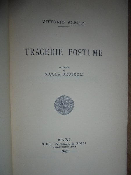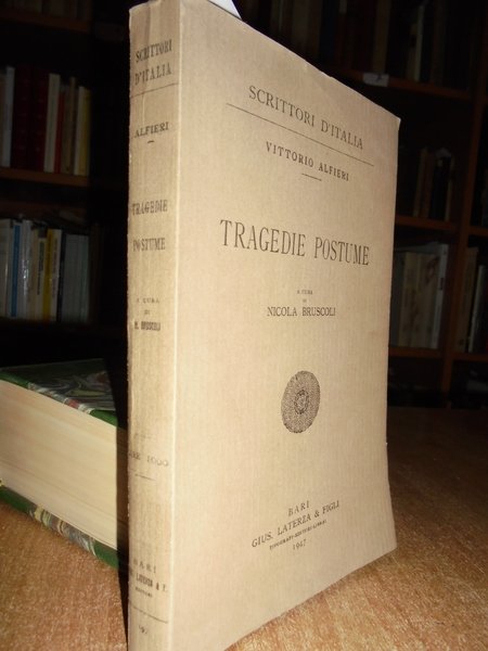 Scrittori d' Italia. Vittorio, Alfieri. Bari, Gius. Laterza & Figli, 1947. Tragedie postume. A cura di Nicola Bruscoli In - 8°, br. orig. 261, (1) pp. Ottimo esemplare (intonso). Neg. mob. 14