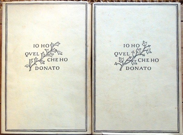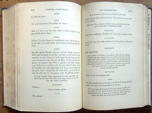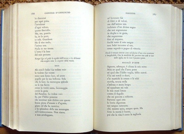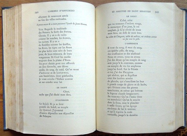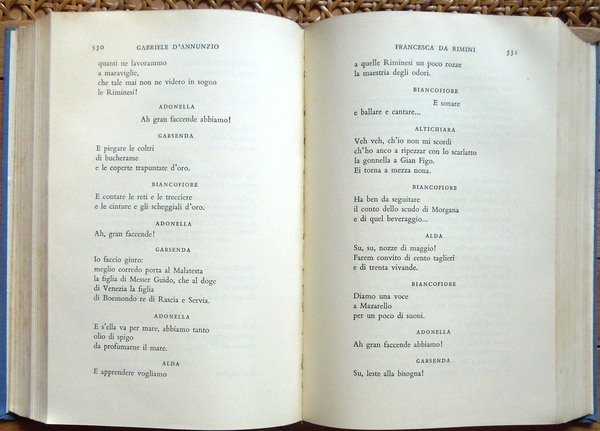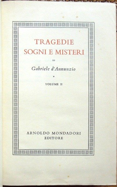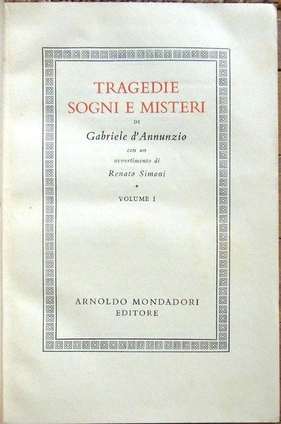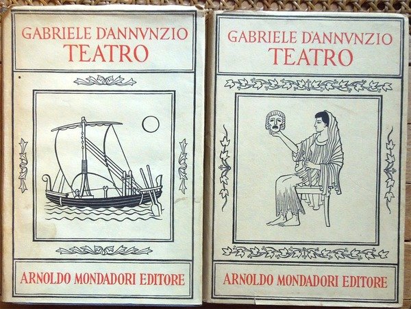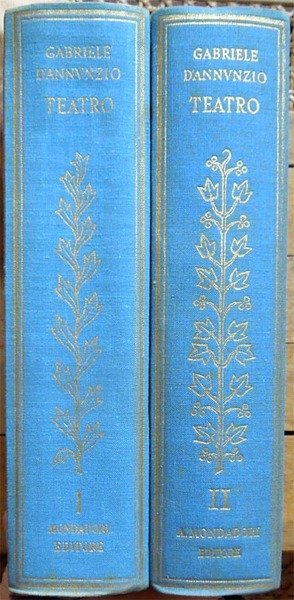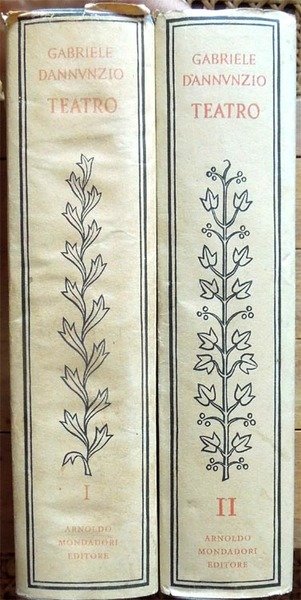 Due voll. in-8°, pp. XIX, 1231; 1169, legatura editoriale con sovrac. All'antiporta del primo volume, ritratto di D'Annunzio protetto da velina. Fac-simile più volte ripiegato entro tasca applicata al contropiatto del secondo volume. Manca il fac-simile del primo volume. Macchioline d'umido limitate alla parte superiore delle pp. 952-953 del primo volume. Edizione composta con caratteri Bembo e impressa su carta tipo India. Indice del primo volume: Avvertimento, di Renato Simoni; Sogno d'un mattino di primavera; Sogno d'un tramonto d'autunno; La città morta; La gioconda; La gloria; Francesca da Rimini; Parisina; La figlia di Iorio; La fiaccola sotto il moggio; Più che amore. Indice del secondo volume: La nave; Fedra; Le martyre de Saint Sebastien; La pisanelle; Le chevrefeuille; Il ferro; Cabiria; La Crociata degi Innocenti.