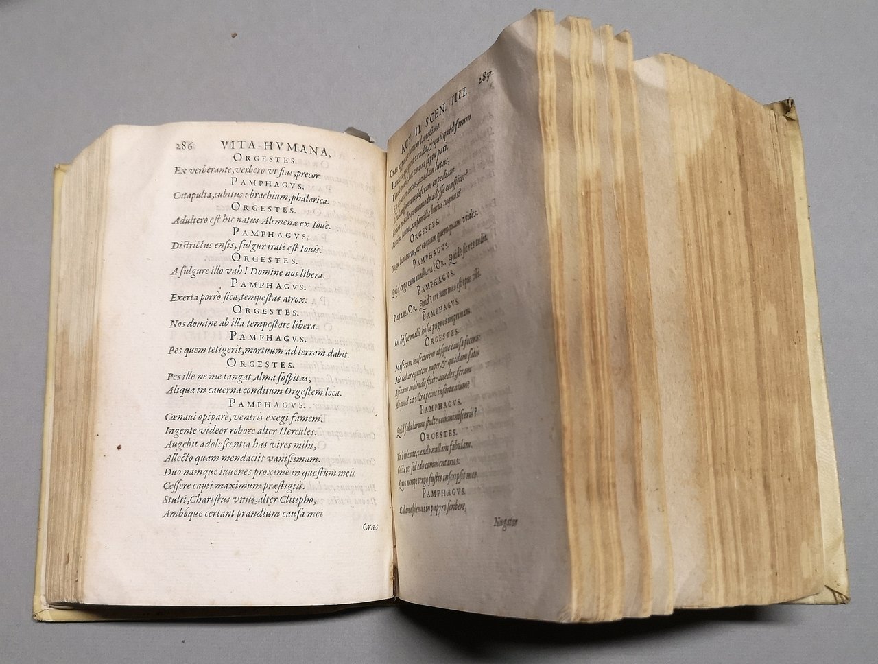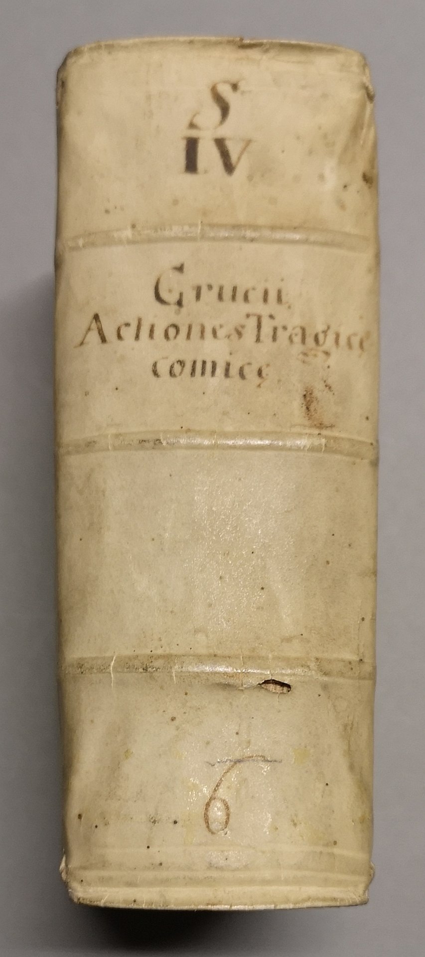 >in-8, pp. (32), 1118, leg. coeva p. perg. Bel tit.-front. inc. con motivo architett. e fig. Dediche a stampa dell'autore al libraio lionese Orazio Cardonio ed altra al vescovo Giov. Brigantino. Testo in car. corsivo, fregi tipogr. Vi si contengono 5 tragicommedie in cinque atti e un prologo (''Prodigus'', ''Vita humana'', ''Sedecias, de excidio Hierosolymae per Nabucdonosorem'', ''Manasses restitutus'', ''Josephus'') ed un'egloga in cinque parti (''Polychronius''). Prima edizione della produzione teatrale del gesuita portoghese, latinizzato in Crucius (Lisbona 1543 -Coimbra 1604). Esempl. in buono stato (un antico timbro ed ex-libris ms. sul secondo f. prelim.). De Backer-Sommervogel II, 1710.2. Soleinne I, 500.