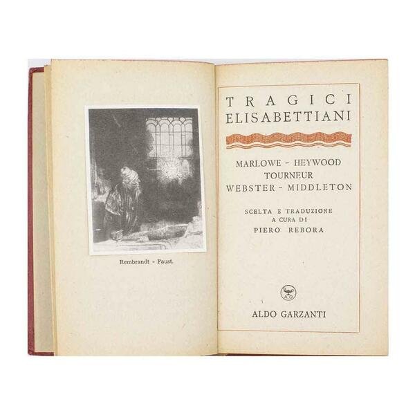 Autore: AA.VV. Titolo: Tragici Elisabettiani  Edizione: Garzanti 1946 Dimensioni: 16,5x10 cm Pagine: 222 Copertina: Cartonato  Condizioni: Ottime come da foto