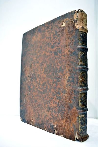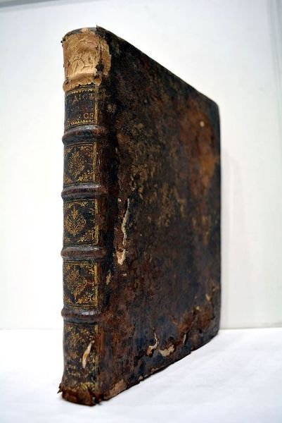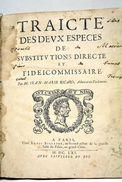 in-4. 6 feuillets. 425 pages. 4 feuillets. (25x19,5cm). Pleine basane de l'époque. Dos à nerfs orné et titré en lettres dorées. Tranches jaspées. Reliure frottée. Epidermures et trous de vers sur les plats et le dos. Accidents aux coiffes. Coins un peu émoussés. Feuillets légèrement brunis. Mouillures. Taches. Roussuers. Petits trous de vers marginaux. Première édition. Jean-Marie Ricard (1622-1678) fut l'un des plus célèbres avocats consultants du Parlement de Paris. Ricard suit ses études au collège de Beauvais, où il fait ses humanités et sa rhétorique sous Godefroy Hermant. En 1641, il part à Bourges étudier son droit sous Edmond Mérille, et est reçu en 1644 au serment d'Avocat au Parlement de Paris. Sa grande érudition fait rapidement de lui l'un des premiers du palais pour la consultation et pour les arbitrages et il est mandé pour conseil par les meilleurs maisons de France. Il fait partie, avec Henris et quelques autres avocats les plus habiles, des conférences sur le droit écrit qu'organisait le Chancelier Séguier. Exemplaire solide, en reliure de l'époque.