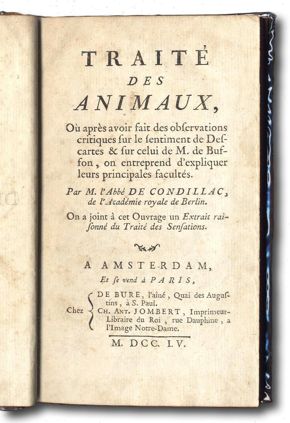 Traité des Animaux, ou après avoir fait des observations critiques sur le sentiment de Descartes & sur celui de Buffon, on entreprend d'expliquer leurs principales facultés. On y joint à cet ouvrage un Extrait raisonné du Traité des Sensations.