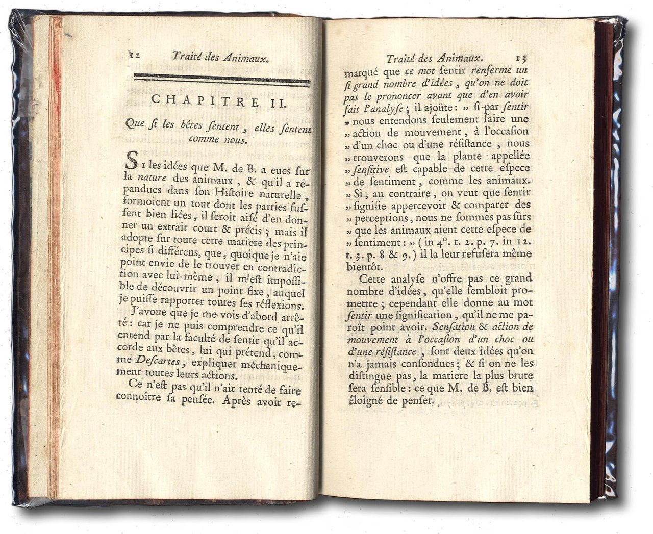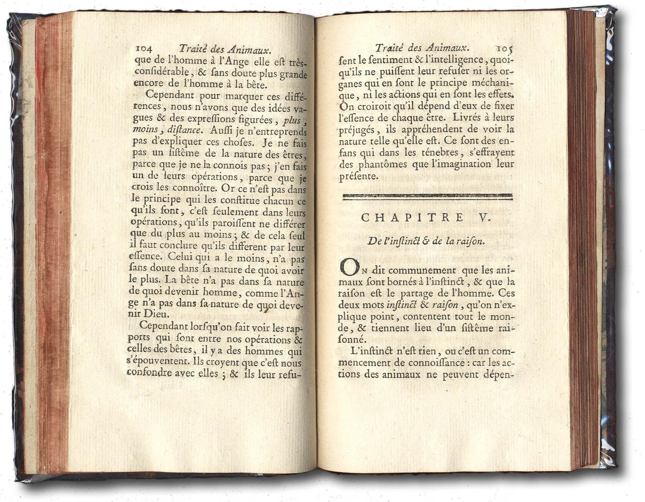 >in-12, pp. VIII, 232, leg. coeva p. pelle, titoloe fregi in oro su dorso a nervi, tagli rossi. Prima edizione. E. Bonnot de Mably de Condillac, celebre filosofo di Grenoble (1715-1780) fondatore del sensualismo, amico di Rousseau e Diderot, critica nella presente opera le idee limitative di Descartes sui sentimenti degli animali. Essi hanno anima, senso della percezione, memoria, capacità di giudizio... come gli esseri umani. Ottimo esemplare. Blake p.97. Tchémerzine III, 478.