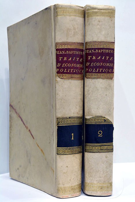 2 tomes en 2 volumes. 1). LXXVIIJ. 438 pages. 2). 2 feuillets. 483 pages. 1 tableau replié. (20,5x13,5 Cm). Plein vélin. Pièces de titre et de tomaison en maroquin rouge et vert. Dos lisse doré. Coins et coiffes émoussés. Taches et salissures. Pertes angulaires sur la pièce de tomaison du tome 2. Traité fondamental dont le succès fut immédiatement très vif, mais qui dût attendre la chute de l'Empire pour connaître sa première réédition. Napoléon avait nommé Say membre du Tribunat en 1799, et après la publication de l'ouvrage en 1803, il encouragea une nouvelle édition avec un soutien explicite aux politiques fiscales impopulaires du gouvernement. Say refusa par principe et fut en retour éjecté du Tribunat. La disgrâce de Say empêcha les éditeurs de risquer une nouvelle édition jusqu'à onze ans plus tard, avec la chute du règne de Napoléon. Par la suite, l'ouvrage connut un grand succès, subissant 32 éditions, devenant l'ouvrage le plus populaire sur l'économie de la première moitié du XIXe siècle. Ses idées et sa terminologie sont devenues classiques et ont servi de modèle à d'innombrables traités ultérieurs. Taches et rousseurs. Papier bruni. Quelques cahiers légèrement déboîtés.