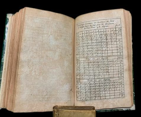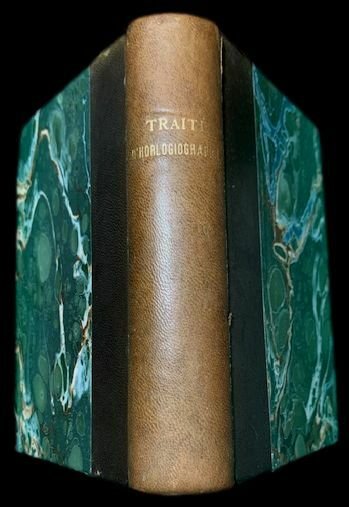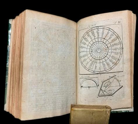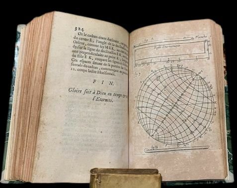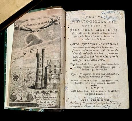 In 8°; (12), 324 pp. e 73 c. di tav. alcune più volte ripiegate, compresa l'antiporta incisa con immagine di orologio solare, poliedri, sfera armillare, rosa dei venti, una nave sul mare ed un palazzo con torre. Antichi timbri e firma ex-libris al frontespizio che iedentifica l'esempalre come appartenuto al cavaliere Antonio Parenti. Legatura di metà novecentesca in mezza-pelle con titolo in oro e piatti foderati con carta marmorizzata. Tagli rossi. Alcuni forellini di tarlo da pagina 15 a pagina 40, da 111 a 143, da 281 a 309 presente un piccolo tunnel di tarlo, a volte restaurato, nel margine esterno bianco ma che però, a volte, sfiora alcune lettere di testo ed in una ventina di pagine lede una lettera di testo per pagina. Da 183 a 248 u n sottile tunnel di tarlo in parte restaurato si sviluppa per qualche millimetro, nel margine basso bianco del volume, sempre lontano dal testo. Per il resto in buone condizioni di conservazione. Quarta edizione rivista ed aumentata, di questo celebre trattato di gnomonica pubblicato per la prima volta nel 1641, scritto da Dom Pierre de Sainte Marie Magdeleine. Applicando i principi della trigonometria sferica, l'autore indica i metodi per costruire tutti i tipi di orologi solari e tracciarli su tutti i tipi di supporti, ma anche Quadranti lunari o metodi per conoscere l'ora di notte usando le stelle. L'opera è uno dei più celebri trattati sull'argomento del XVII° secolo. Il lavoro si conclude con elementi di stereotomia. Rif. Bibl.: Houzeau & Lancaster, 11455; Tardy, 220; Polak, 8584.