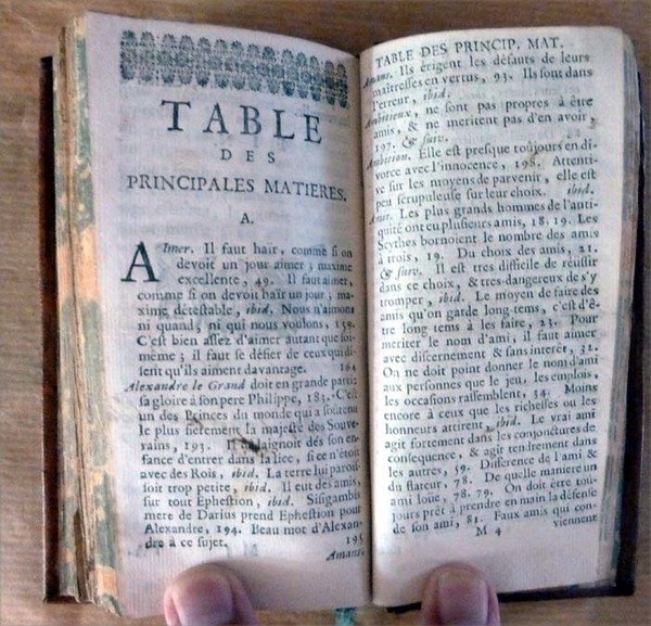 Un volume de format in 16 de XVI pp.; 298 pp. Reliure légèrement postérieure en pleine basane marbrée; dos lisse, caissons et titre dorés. tranches marbrées. Exemplaire court de marge. Manque de papier à la dernière page (tables). Quelques pages courtes de marge. Peu fréquent.